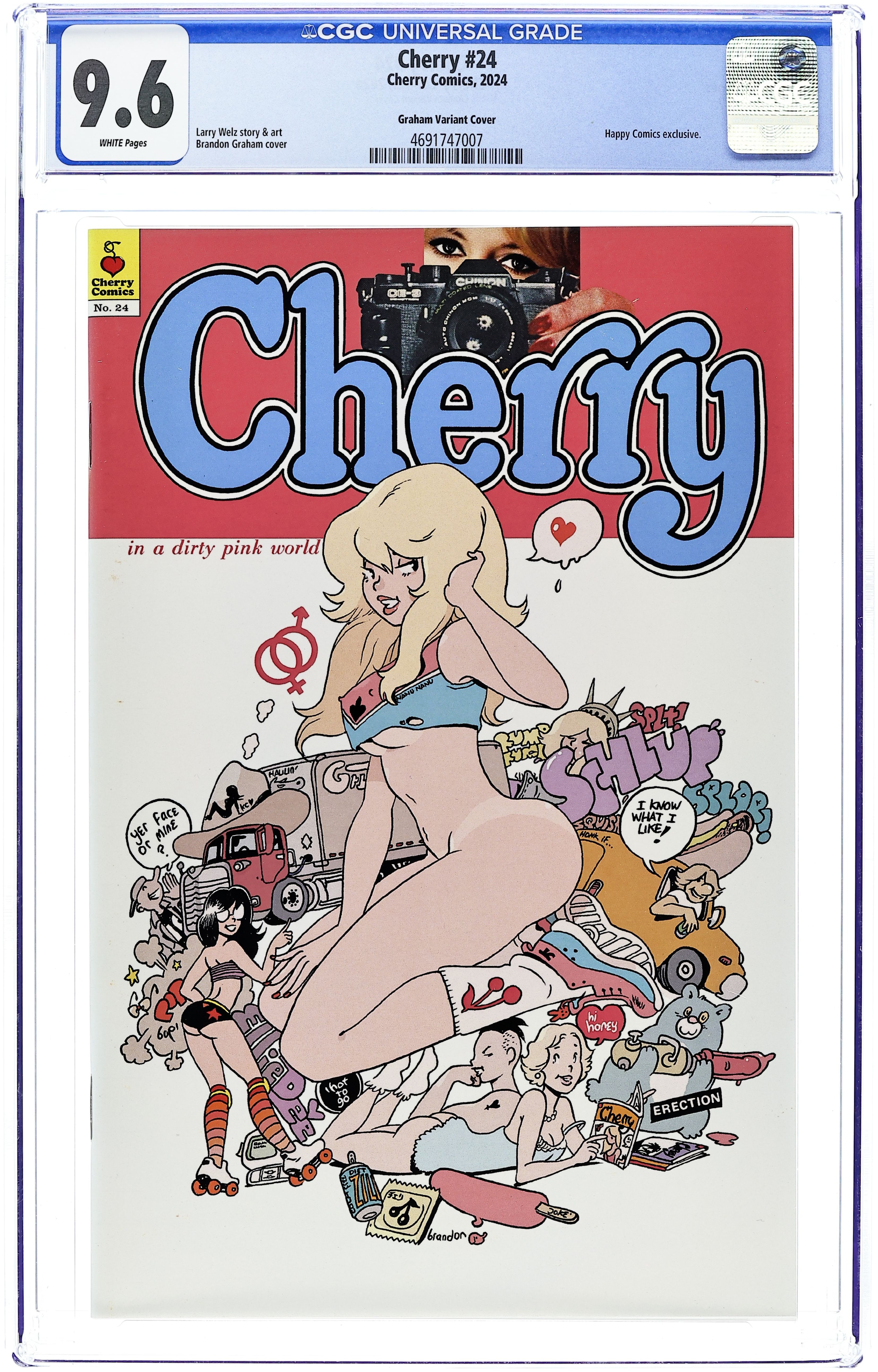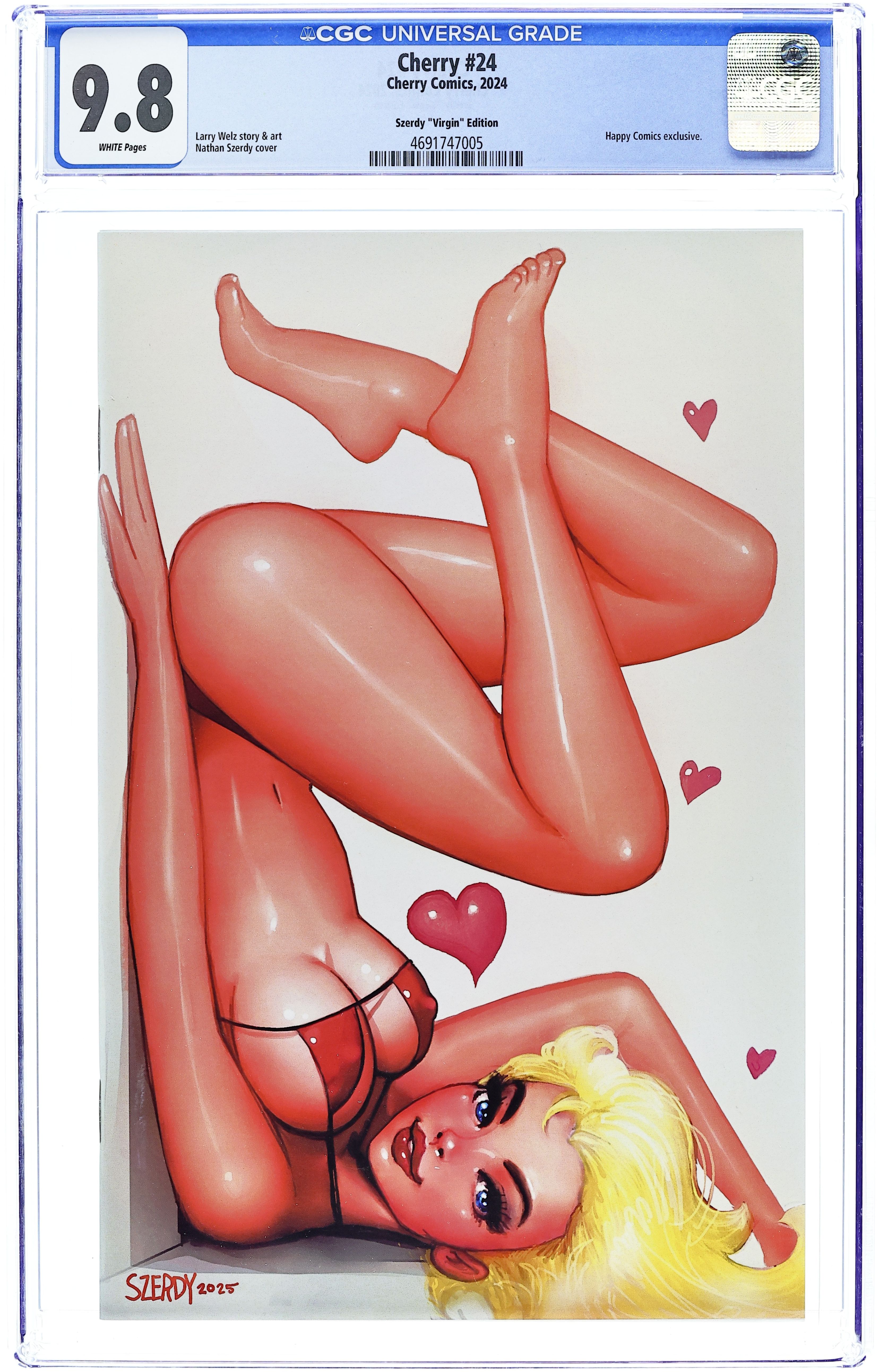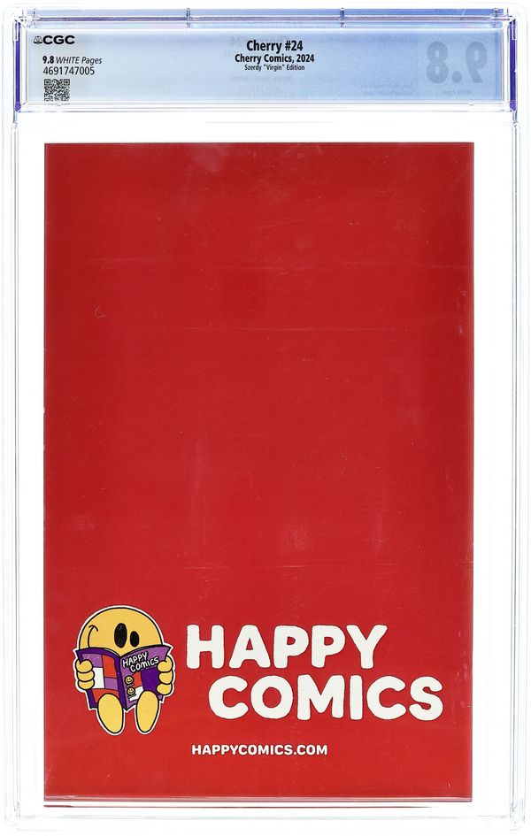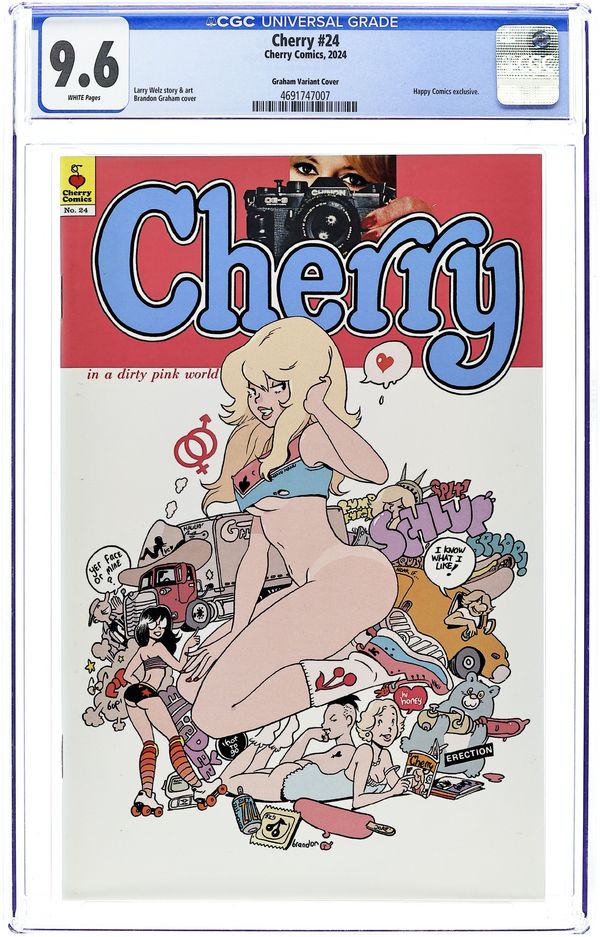 Happy Comics Exclusive Signed Edition Virgin Cover by Adam Hughes - limited to 100 Copies, Signed by cover artist, Adam Hughes. Story and Art by Larry Welz. Cherry #24 is bigger, longer, and harder than ever. It's a 48 page monster that has the next two chapters of the exciting ongoing epic. This issue also features All New Cherry Pin Ups by, Scott Diggs Underwood (Ed Edd n' Eddy, The Addams Family), Joe Pekar (Grimm Fairy Tales), Tuco El Buitre (Mademoiselle De Sade), Robert Ullman (Atom Bomb Bikini), Chance Wolf (Spawn, The Pitt), PHILO (Tales of Shaundra), Aaron Bordner (Alice Sinn, Monster High School) & Steven S. Crompton (Demi The Demoness). With Guest Strips by MastaJWood (Marvel, Dynamite), Shlepzig (Red, File 2231), & Gary Yap (Simpsons, King of the Hill).