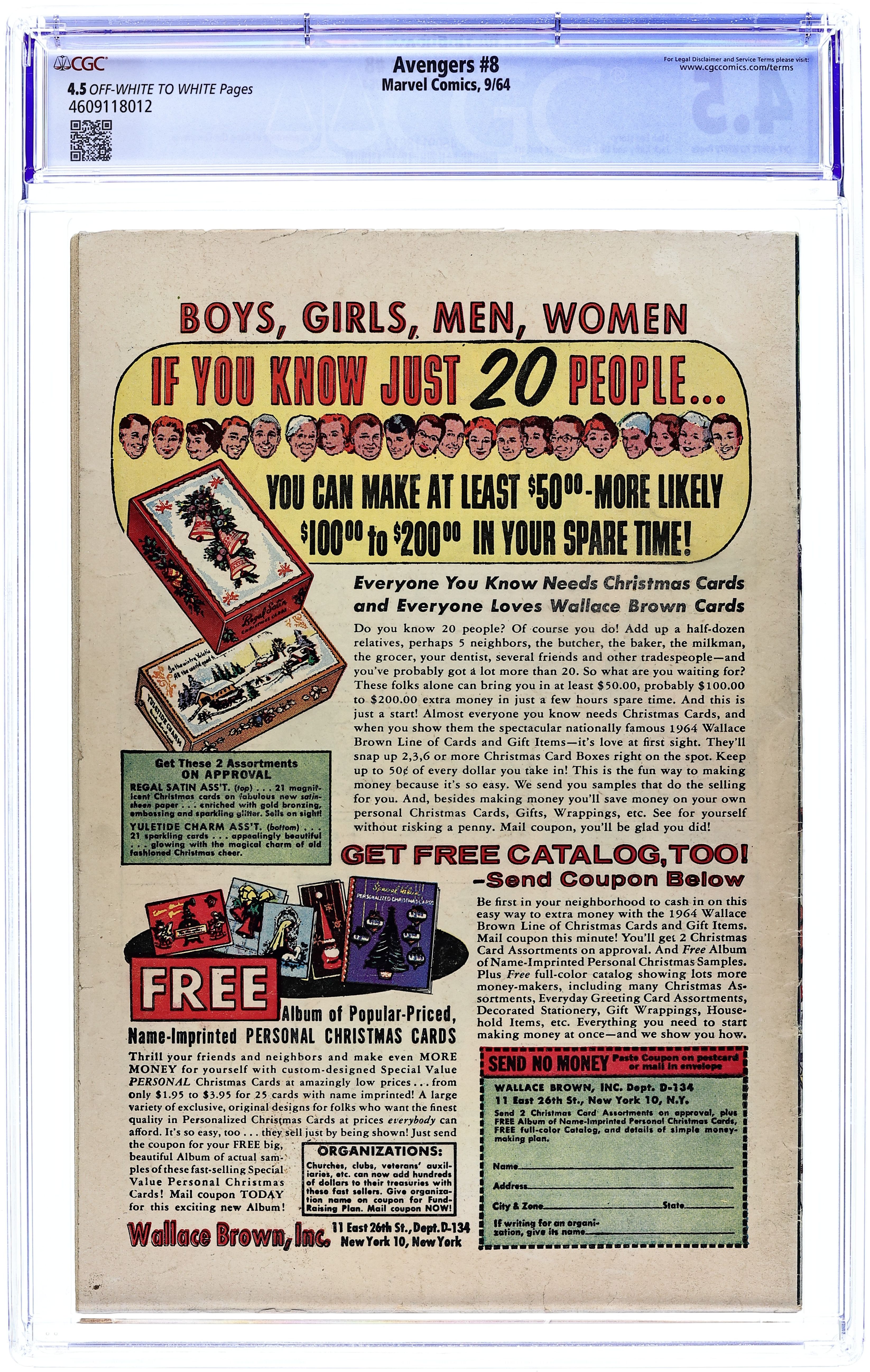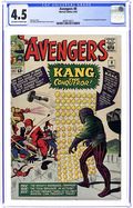 Cover pencils by Jack Kirby, inks by Dick Ayers. Kang, The Conqueror!, script by Stan Lee, pencils by Jack Kirby, inks by Vince Colletta cover; Kang appears and demands to be made ruler of the Earth; The Avengers attempt to stop him, but it comes down to Wasp and the Teen Brigade to slow Kang long enough for the rest of the Avengers to free themselves and put an end to Kang's threat. Roster: Captain America, Thor, Iron Man, Wasp, Giant-Man, and Rick Jones. First appearance of Kang. 36 pgs. $0.12. Cover price $0.12.