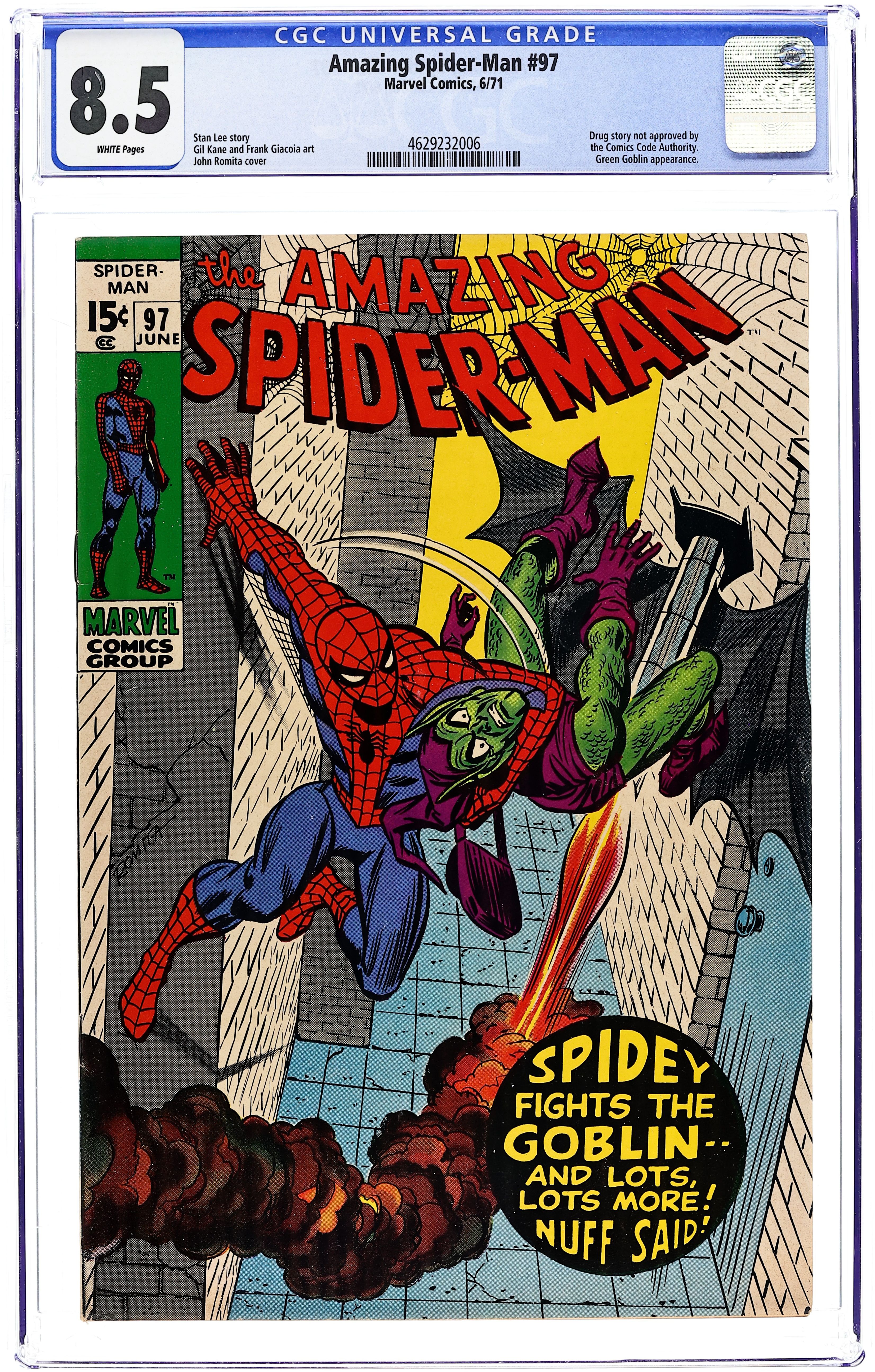 Not approved by the Comics Code Authority. "In the Grip of the Goblin!" Part 2 of 3. Script by Stan Lee. Pencils by Gil Kane. Inks by Frank Giacoia and John Romita. Cover by John Romita. The fireworks start immediately as the Amazing Spider-Man battles the Green Goblin! And since the web-slinger is always cautious fighting Norman Osborn's alter ego, the goblin wins rounds one -- thanks to his assortment of bizarre weapons! As Peter Parker heads home, he knows the goblin could reveal his secret identity at any moment. But right now Peter has a second problem. His roommate Harry is miffed about Mary Jane...and popping pills left and right! When Peter calls a doctor to get Harry help, someone clad in purple and green shows up first! Oh no, the wall-crawler is caught between a rock and a hard place...with no way out! (Note: This story was reprinted in Marvel Tales #78.) 36 pages. Cover price $0.15.