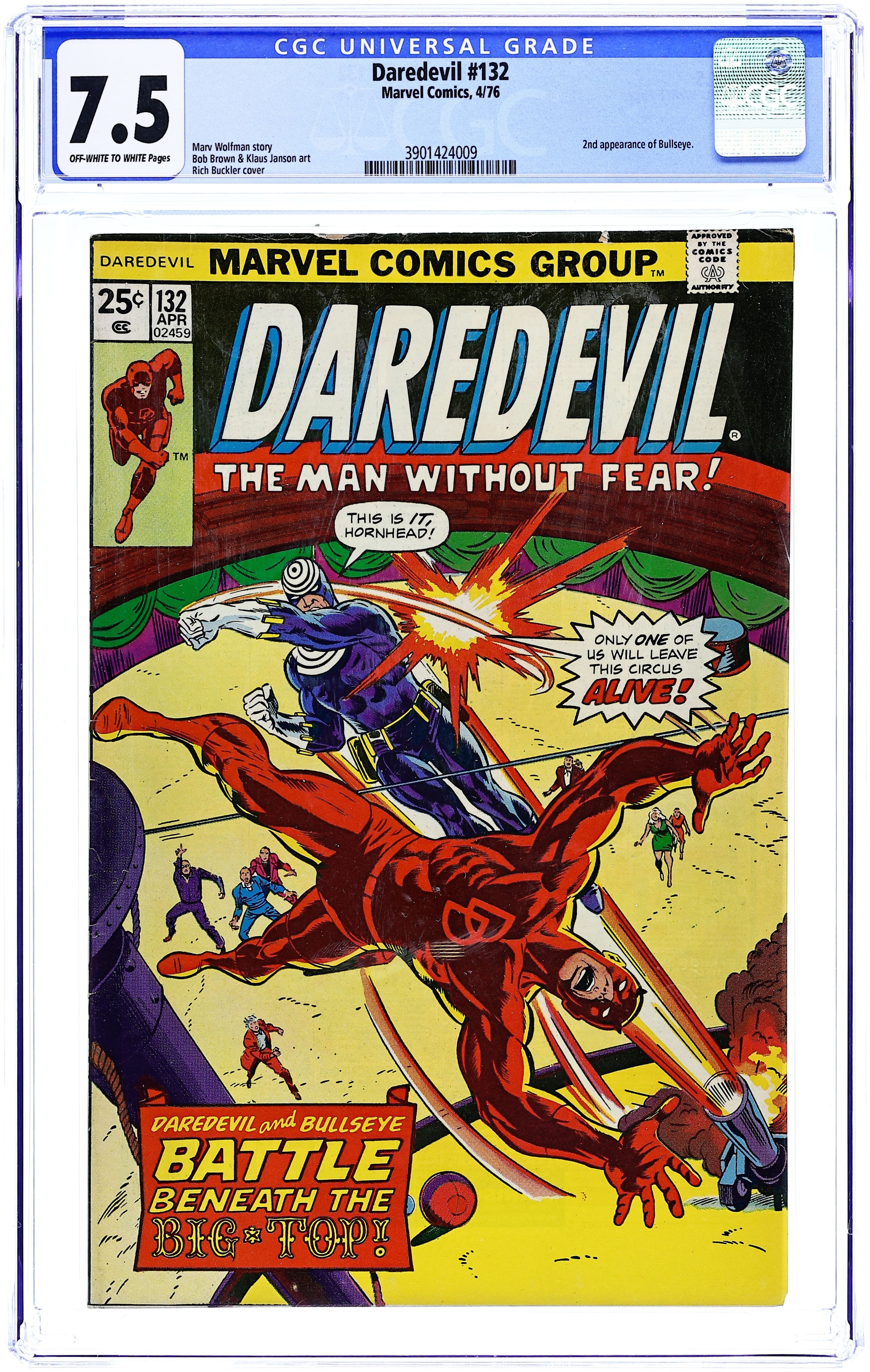 Cover pencils by Rich Buckler, inks by Frank Giacoia. Origin and first appearance of the new Bullseye in Watch Out For Bullseye--He Never Misses!, script by Marv Wolfman, pencils by Bob Brown (breakdowns) and Klaus Janson (finished art), inks by Klaus Janson; Matt finds out about a tenement slum owned by Glenn Industries; Bullseye kills with a ball point pen; DD gets the skinny on Bullseye from a Bugle reporter; When DD chases down Bullseye, he ends up in a circus ring where he is about to have a very public fight for his life. (See Nick Fury Agent of SHIELD (1968 1st Series) #15 for the first Bullseye.) The letters page contains Marvel Value Stamp series B #47 (Thor by Jack Kirby). 32 pgs. Cover price $0.25. Cover price $0.25.