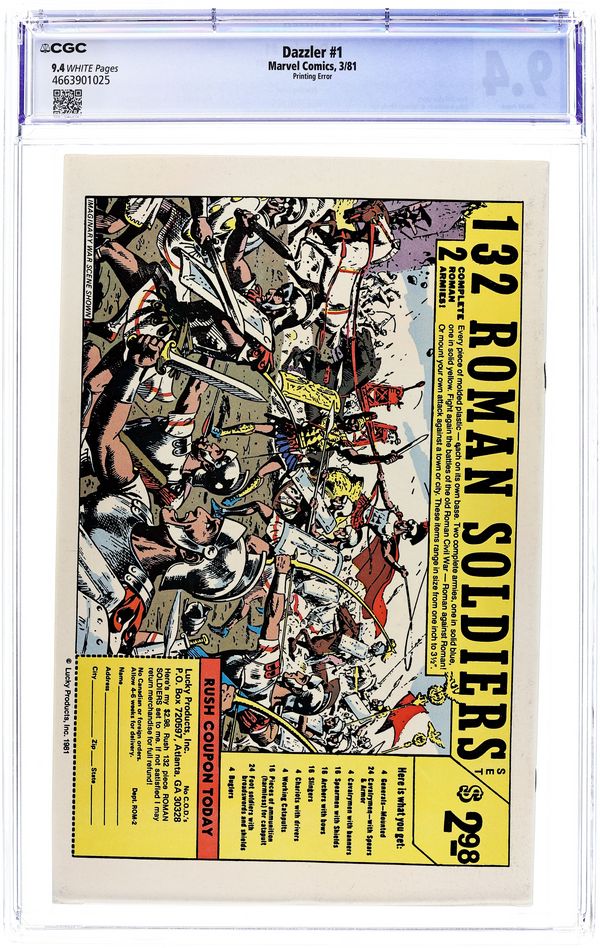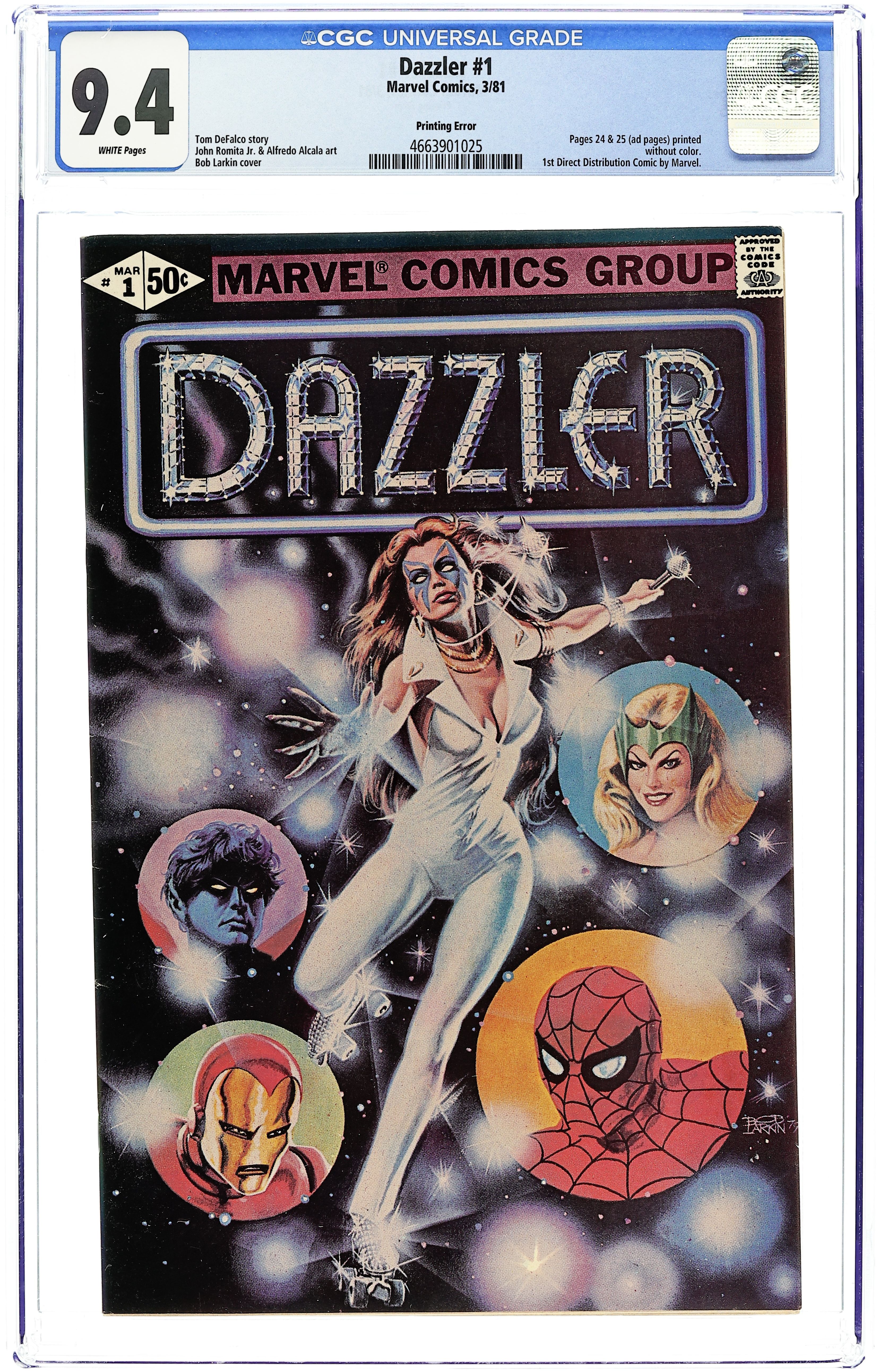 Error version with pages 24 & 25 printed in black and white. Dazzler origin in "So Bright This Star." Script by Tom DeFalco, pencils by John Romite Jr., inks by Alfredo Alcala. Guest appearances by Spider-Man, the X-Men (Storm, Wolverine, Colossus, Nightcrawler, and Sprite), the Avengers (Hawkeye, the Beast, Iron Man, the Wasp, and Captain America), and the Enchantress. This issue was not sold on newsstands, but available only from direst-sale outlets. Bob Larkin painted cover. Cover price $0.50.