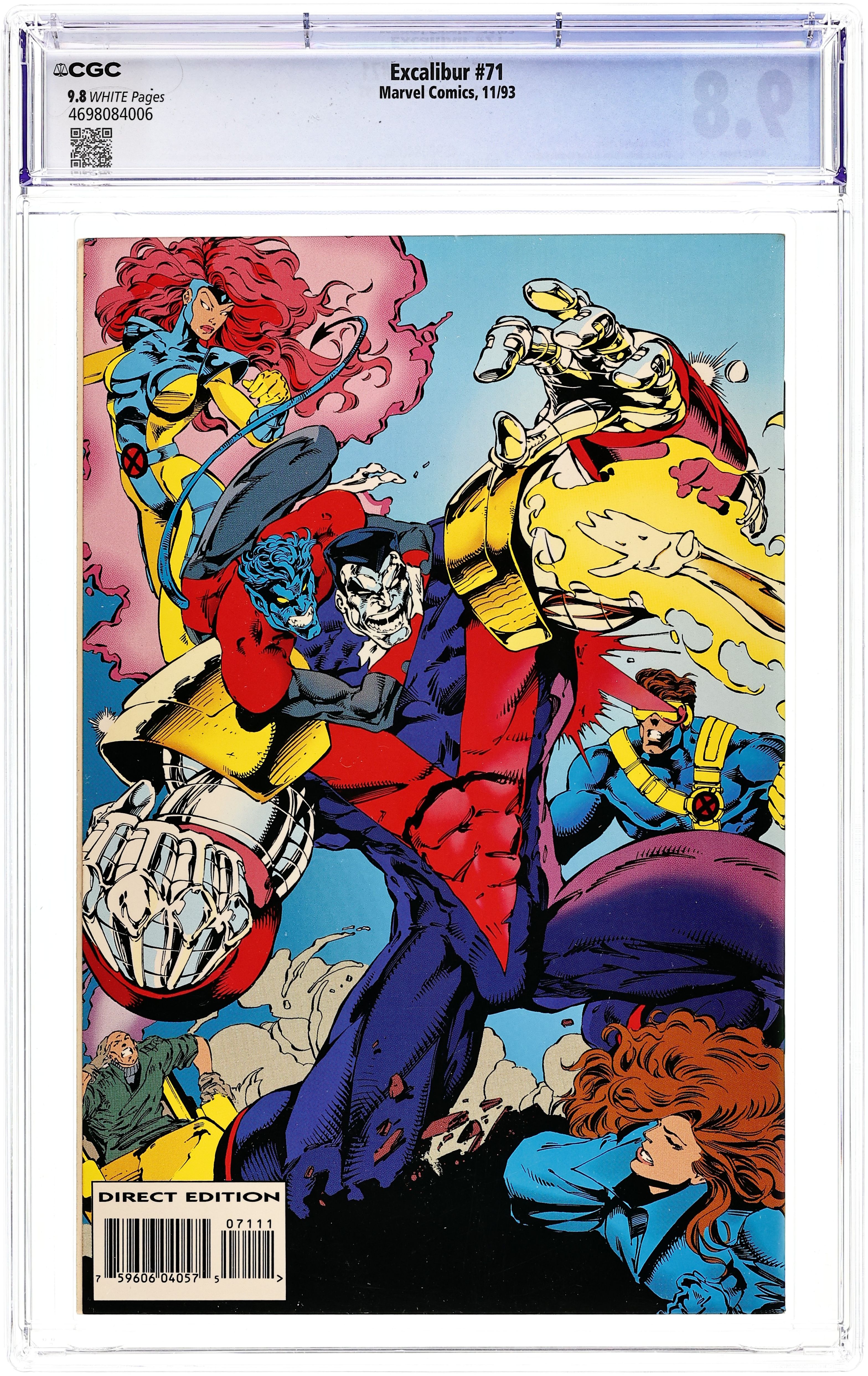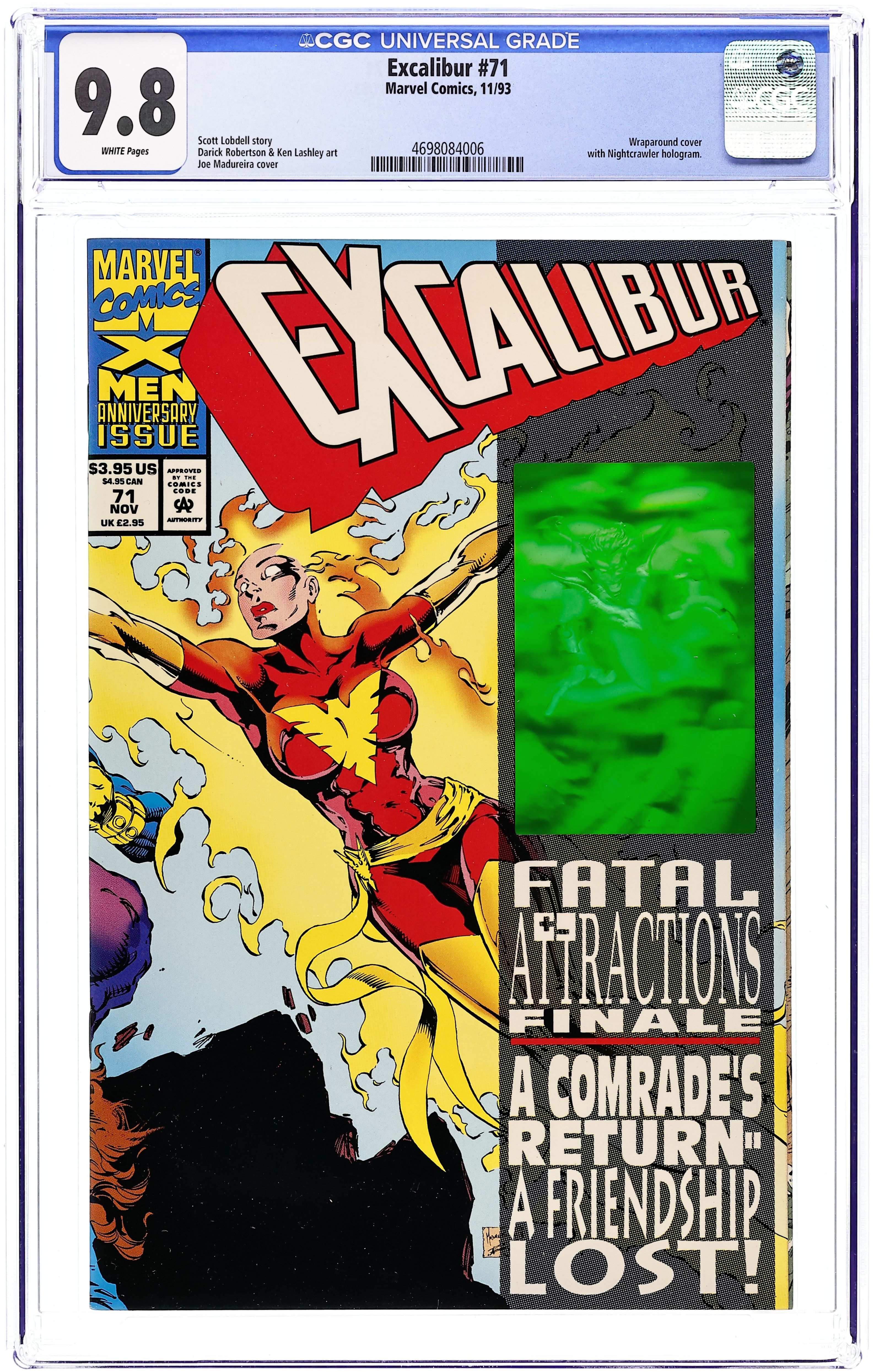 Fatal Attractions:Part 6 of 6 - Giant-size issue. Nightcrawler hologram cover. "Crossing Swords!" Guest-starring Cable and the X-Men. Story by Scott Lobdell. Art by Ken Lashley, Darick Robertson, and Matthew Ryan. Wraparound Cover by Joe Madureira and Richard Bennett. In the dramatic conclusion to FATAL ATTRACTIONS, Jean Grey, Rachel Summers, and Cable come together with explosive results. meanwhile, Colossus is confronted by the team he betrayed. Plus, a bold new direction for Excalibur. 48 pages, FC. Cover price $3.95.