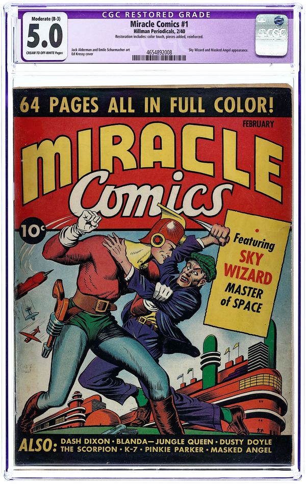 Cover by Ed Kressy. Stories and art by Emile C. Schurmacher, Ed Kressy, Norman Fallon and Jack Alderman. The very first comic book from publisher Hillman, featuring Sky Wizard, Dash Dixon and other embryonic superheroes. Sky Wizard, the world's greatest inventor, creates an enormous flying island, but when his pilot Captain Dare is kidnapped by the Tibetan supervillain the Unholy One, he uses his inventions to gain superhuman strength and set out in pursuit. Experimental "perpetual life rays" give Dash Dixon superpowers, which he uses to fight crime. Steve Oakes becomes the Masked Angel to catch the gangsters who killed his father, and winds up hunted by crooks and cops alike. Sky Wizard; K-7; Dusty Doyle; Dash Dixon: The Triangle Murders; Scorpion; Blanda; Masked Angel; Pinkie Parker: Kid Sherlock. 68 pages, Full Color. Cover price $0.10.