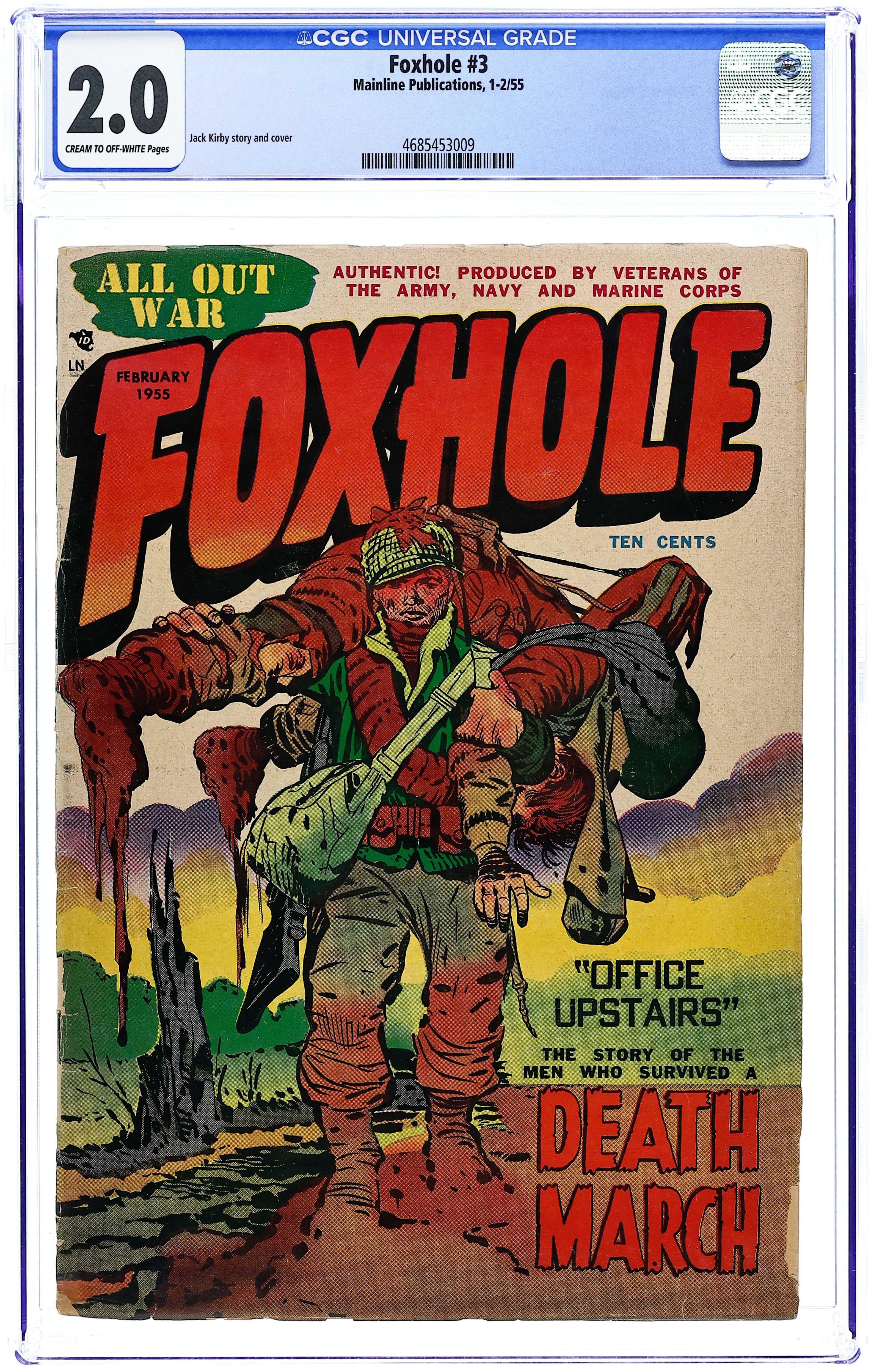Cover by Jack Kirby. Stories and art by Jack Kirby, Hy Fleishman, and Bill Draut. Gritty war comics "produced by veterans" (as the tagline proclaims) from Mainline, the publisher founded by comics legends Joe Simon and Jack Kirby, creators of Captain America. In a suspenseful Kirby tale, a soldier slowly approaches a seemingly deserted Korean farmhouse. A Korean spy tries to lure American soldiers into a trap, but he makes one crucial mistake. Sarge and his men know they must fight their way out of the Hotbox. Booby Trap; Action; Walkie-Talkie; Hot Box; Dishonorable Discharge; Yellow; Replacement. 32 pages, Full Color. Cover price $0.10.