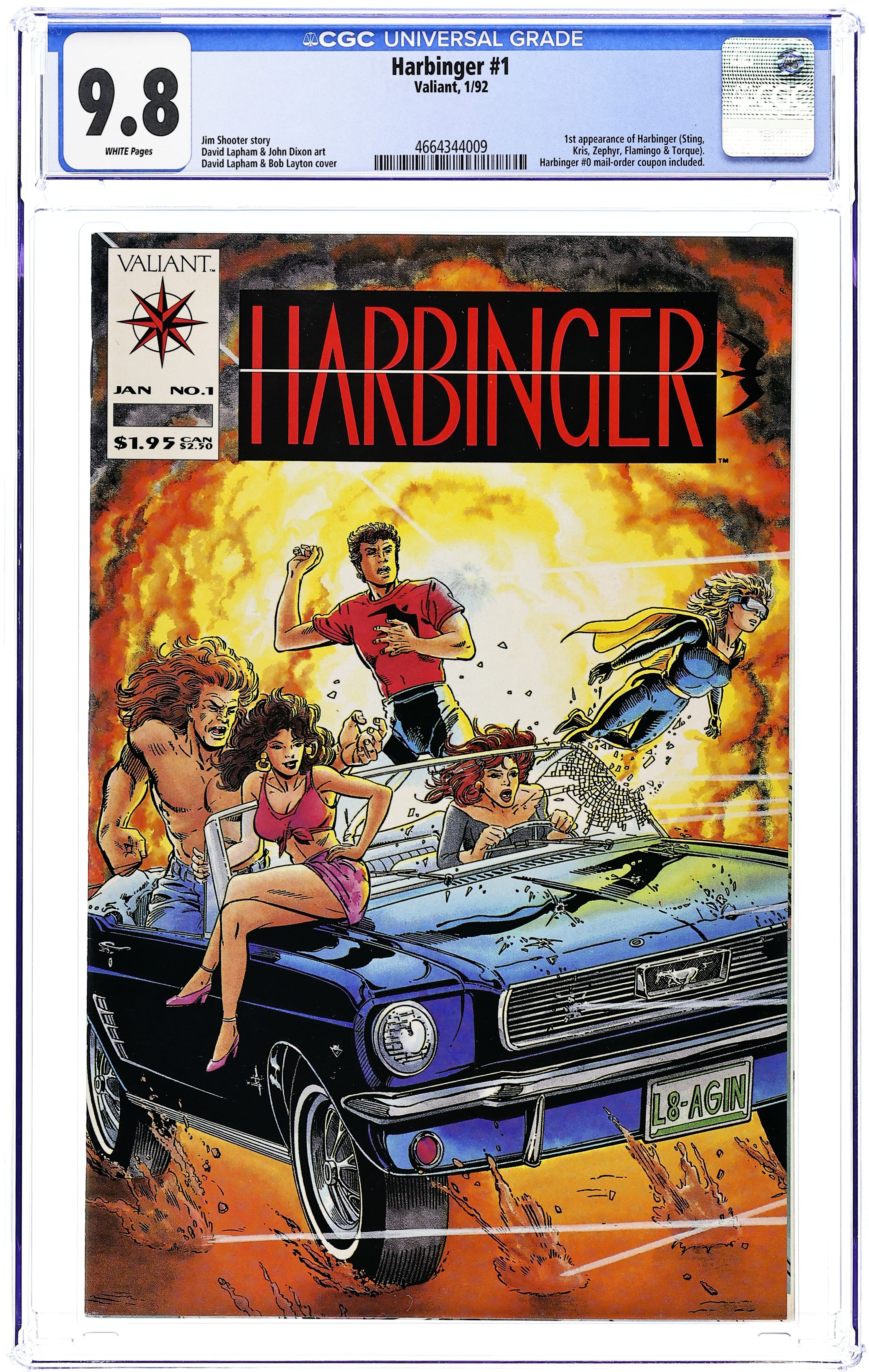 Trading Card/Coupon insert is not in centerfold. Cover pencils by David Lapham, inks by Bob Layton. Children of the Eighth Day, script by Jim Shooter, pencils by David Lapham, inks by John Dixon; Sting and Kris recruit Zephyr, Flamingo and Torque to oppose Toyo Harada's Harbinger organization; Harada's henchmen attack them and injure Kris. 36 pgs. $1.95. Cover price $1.95.