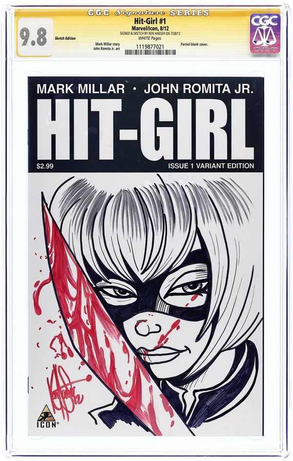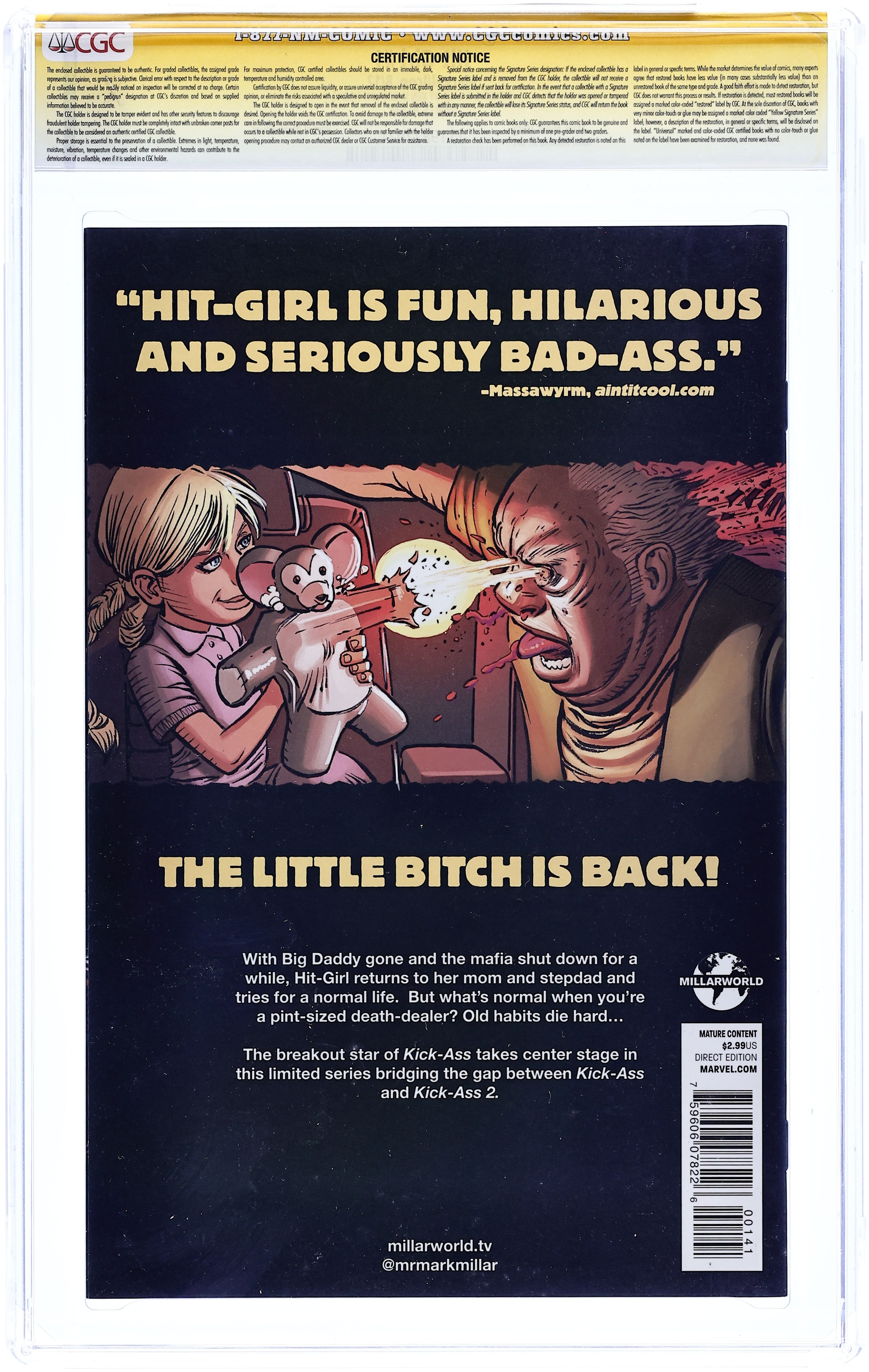 Blank Variant (W) Mark Millar (A) John Romita From Marvel Comics. Hit-Girl spins off into her own blood-soaked series by the sales-busting creative team of Mark Millar and John Romita Jr. This story takes place between Kick-Ass Volumes 1 and 2 as Mindy McCready tries to settle into life as a regular school-girl, but wants nothing more than to be dispensing hot justice to the scum of New York City. Her mother and step-father think she's doing her homework, but in reality she's taken Kick-Ass on as her sidekick and is training him up to punch, shoot and stab ... just like Daddy would have wanted. Cover price $2.99.