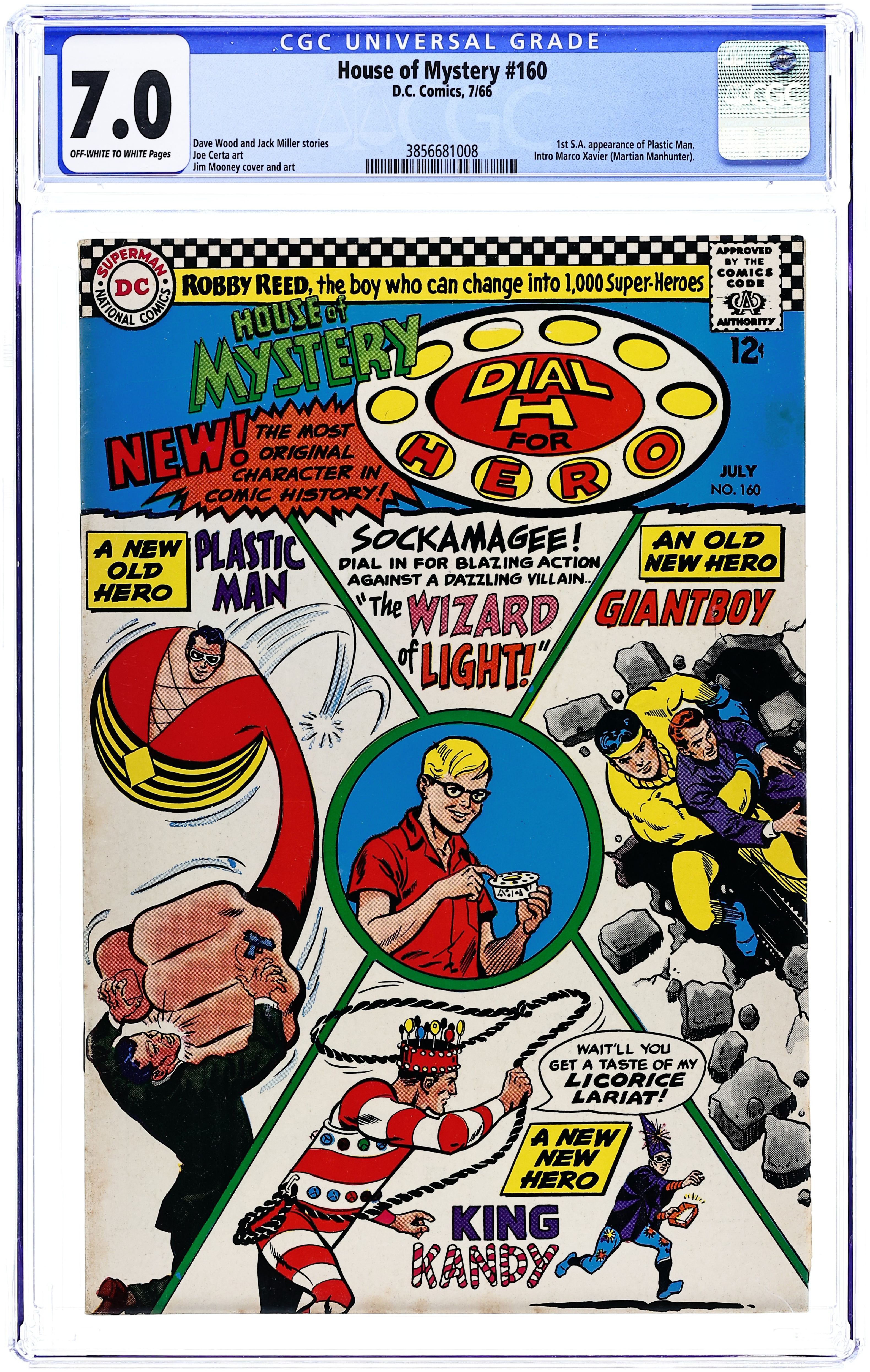 Cover art by Jim Mooney. Batman ad. 1st Silver Age appearance of Plastic Man in the Dial H for Hero story "The Wizard of Light," script by Dave Wood, art by Jim Mooney; While staying with his cousin Ned, Robby Reed uses his H-Dial to battle the villainous Wizard of Light in various super-heroic guises, including that of Plastic Man! "Natural Beauty -- Everybody's Fight" public service announcement, script by Jack Schiff; excerpts from a speech by President Lyndon Johnson regarding the preservation of nature. Teen Titans ad. Letter to the editor from Irene Vartanoff. Statement of ownership--average print run 331,000; average print run 196,677. "Manhunter's New Secret Identity" starring J'onn J'onzz Manhunter from Mars, script by Jack Miller, art by Joe Certa; Manhunter agrees to infiltrate the criminal organization called VULTURE; He assumes the identity of Marce Xavier, a European playboy who recently died in an accident but whose death was not reported. Batman and Robin ad. 36 Pages, Full Color. Cover price $0.12.