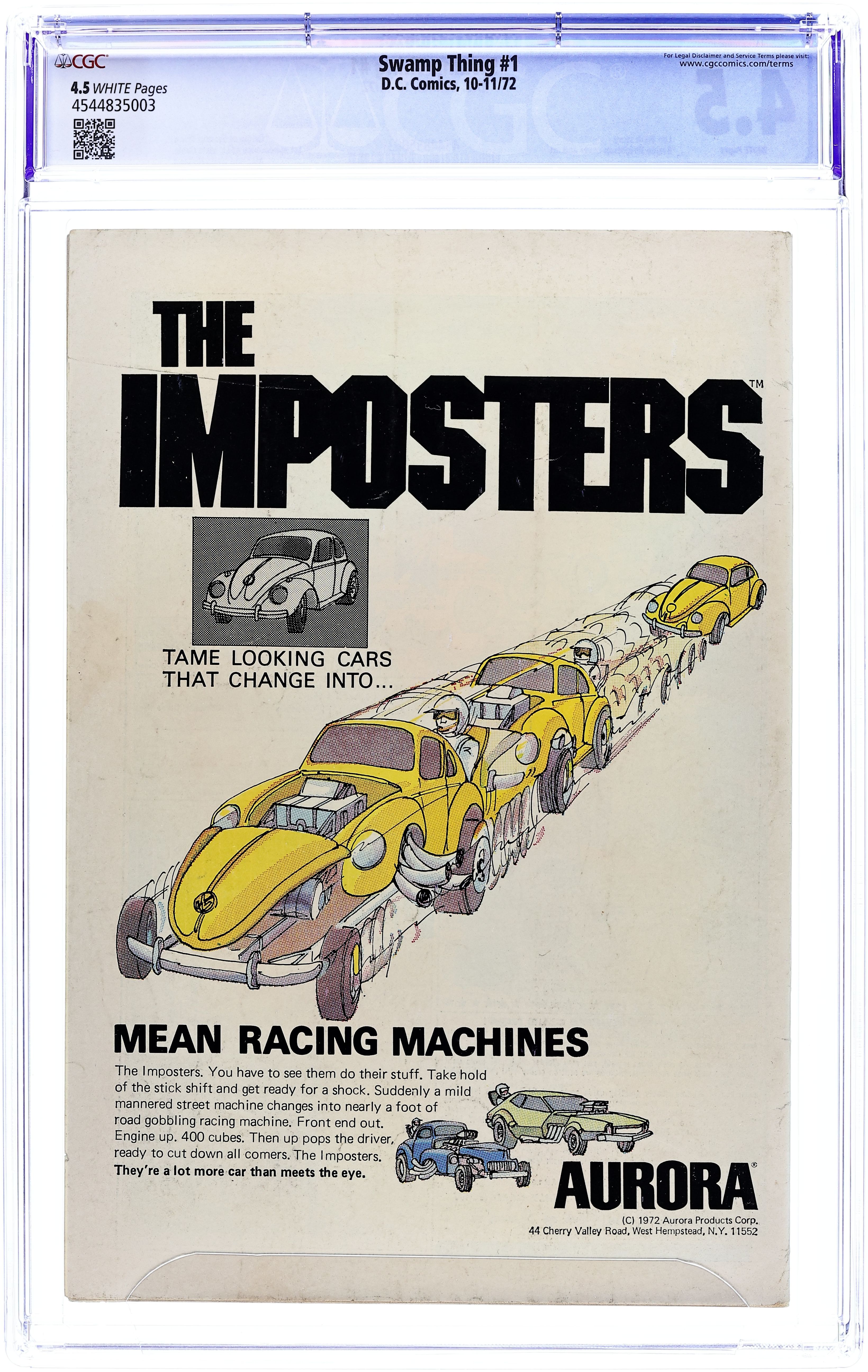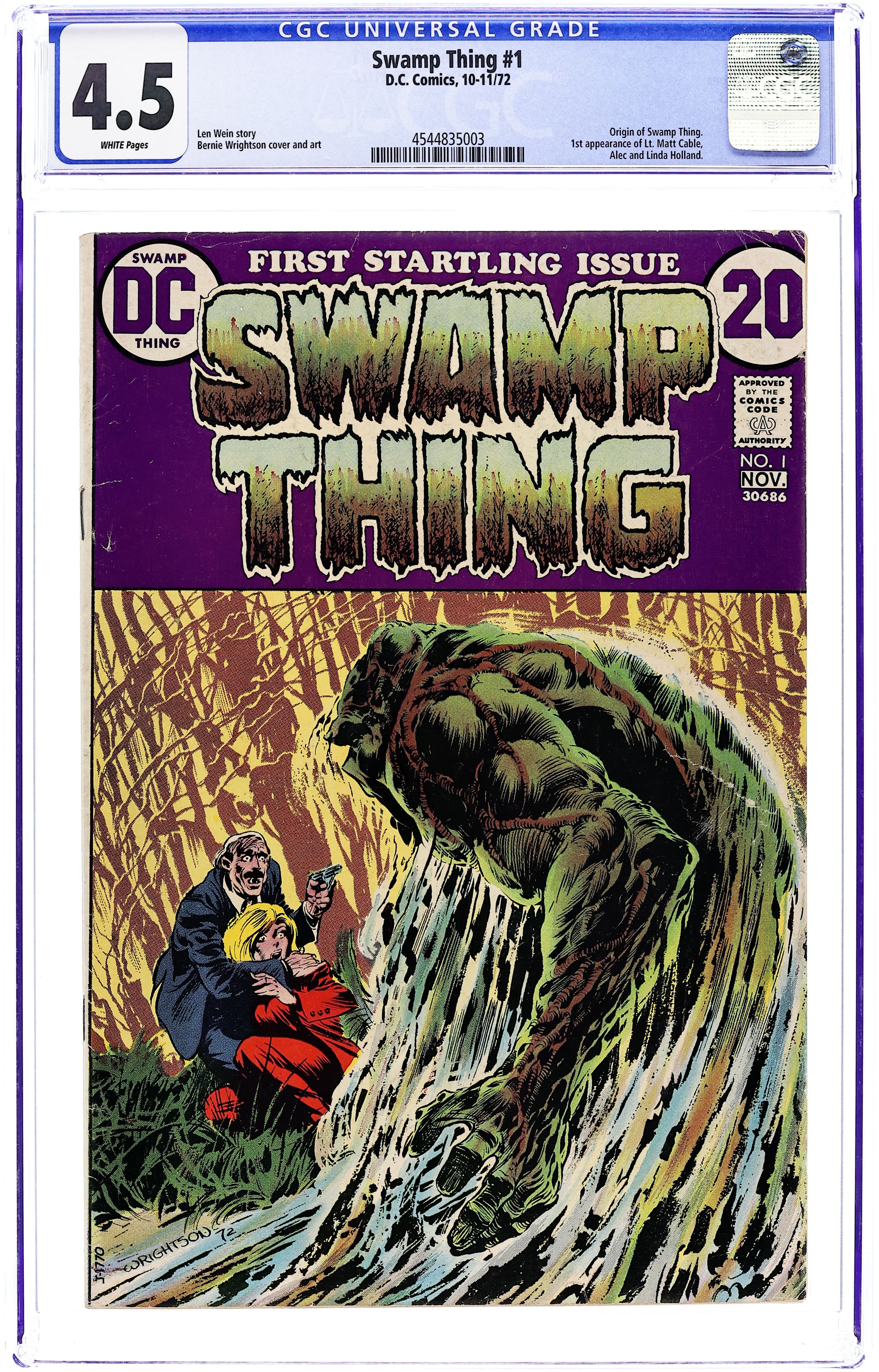 "Dark Genesis." While working on a restorative formula (that can make forests out of deserts) in the Louisiana swamps, scientist Alec Holland is killed by a bomb set off by Mr. E., who wants the formula. Shortly thereafter, a humanoid plant being rises from the swamp, created from the body of Holland, the chemicals in the formula, and the strange forces in the swamp. 1st appearance of Alec and Linda Holland. 1st appearance of Matt Cable. (Swamp Thing himself first appeared in House of Secrets 92). Script by Len Wein, art and cover by Berni Wrightson. Includes brief bios of Wein and Wrightson. Cover price $0.20.