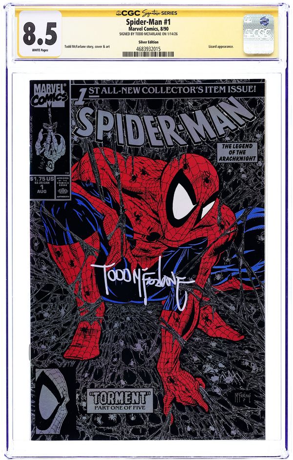Unbagged Direct Edition - Torment Part 1 of 5. "Torment" Script and art by Todd McFarlane. Cover by Todd McFarlane. Fresh off his legendary run on the Amazing Spider-Man series, superstar artist Todd McFarlane takes the reins of his own Spider-title! Right off the bat the breathtaking action begins as mysterious and ominous drums awaken the Lethal Lizard! And send the reptilian creature on a path of death and destruction thru New York City! Spider-Man's nightmare is just starting! Appearance by Mary Jane Watson. (Notes: Spider-Man #1 was one of the first Marvel issues to feature numerous variant covers. The Spider-Man (1990) series became the fourth monthly title for the web-slinger. This issue was published the same month as Amazing Spider-Man 337. The letters page features an essay by Todd McFarlane. The webbing on the cover may be gray or purple.) 32 pages. Cover price $1.75.