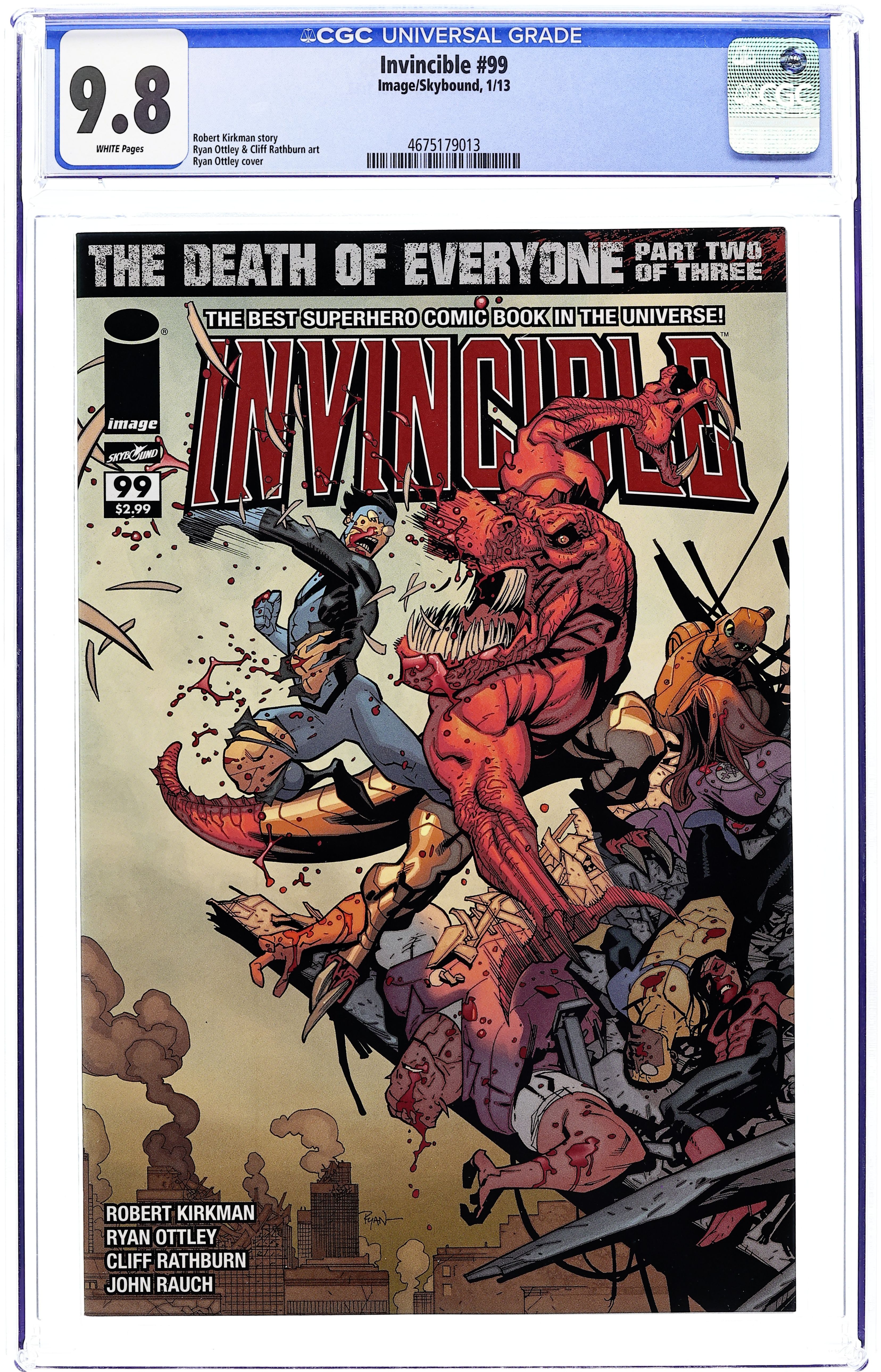 Wraparound Chromium Variant Cover by Ryan Ottley Death of Everyone: Part 3 of 3 - (W) Robert Kirkman (A) Ryan Ottley, John Rauch 10th ANNIVERSARY LANDMARK 100 th ISSUE SPECTACULAR! THE DEATH OF EVERYONE: CONCLUSION! It's all been building to this. Mark Grayson's entire life as a superhero, all he's learned, all he's endured, it's all been leading to this one moment. Will he become the hero he was meant to or will he choose... a DIFFERENT path? The aftermath of this EXTRA-SIZED issue will shock you. Cover price $9.99.