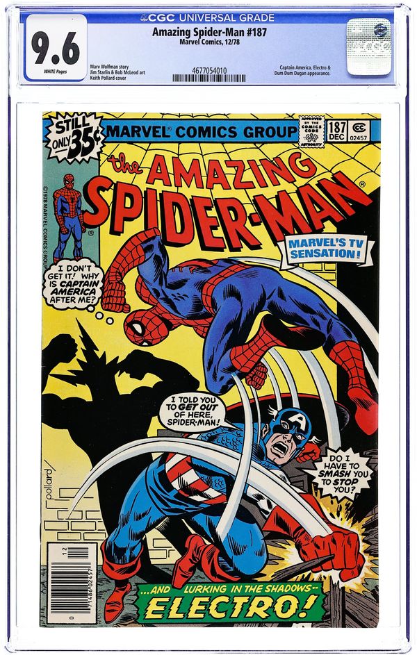 "The Power of Electro!" Guest-starring Captain America. Plot by Marv Wolfman and Jim Starlin. Script by Marv Wolfman. Brilliant art by Jim Starlin (layouts) and Bob McLeod (finishes). Cover by Keith Pollard. It's an overstuffed tale featuring the star-spangled avenger, web-slinger, SHIELD, Electro, and the bubonic plague! When the Daily Bugle receives a tip that authorities have cordoned off the neighborhoods surrounding the Indian Point Power Station, Jonah sends his ace photographer to investigate! The web-slinger easily slips past the SHIELD agents but runs into a problem after bumping into the Sentinel of Liberty! Cap wants the wall-crawler to leave the area ASAP! But Cap would think differently if he knew that an electrifying encounter awaits! The Amazing Spider-Man and Captain America vs. Electro! Cameo appearances by Dum Dum Dugan, J. Jonah Jameson, and Joe Robertson. (Notes: This is one of only three issues Jim Starlin drew for the Amazing Spider-Man title (1st series): issues 113, 114, and 187. More of Jim Starlin's artwork featuring Spider-Man can be seen in Marvel Two-in-One Annual 2. The web-slinger and Electro previously battled in Marvel Team-Up 56.) 36 pages Cover price $0.35.