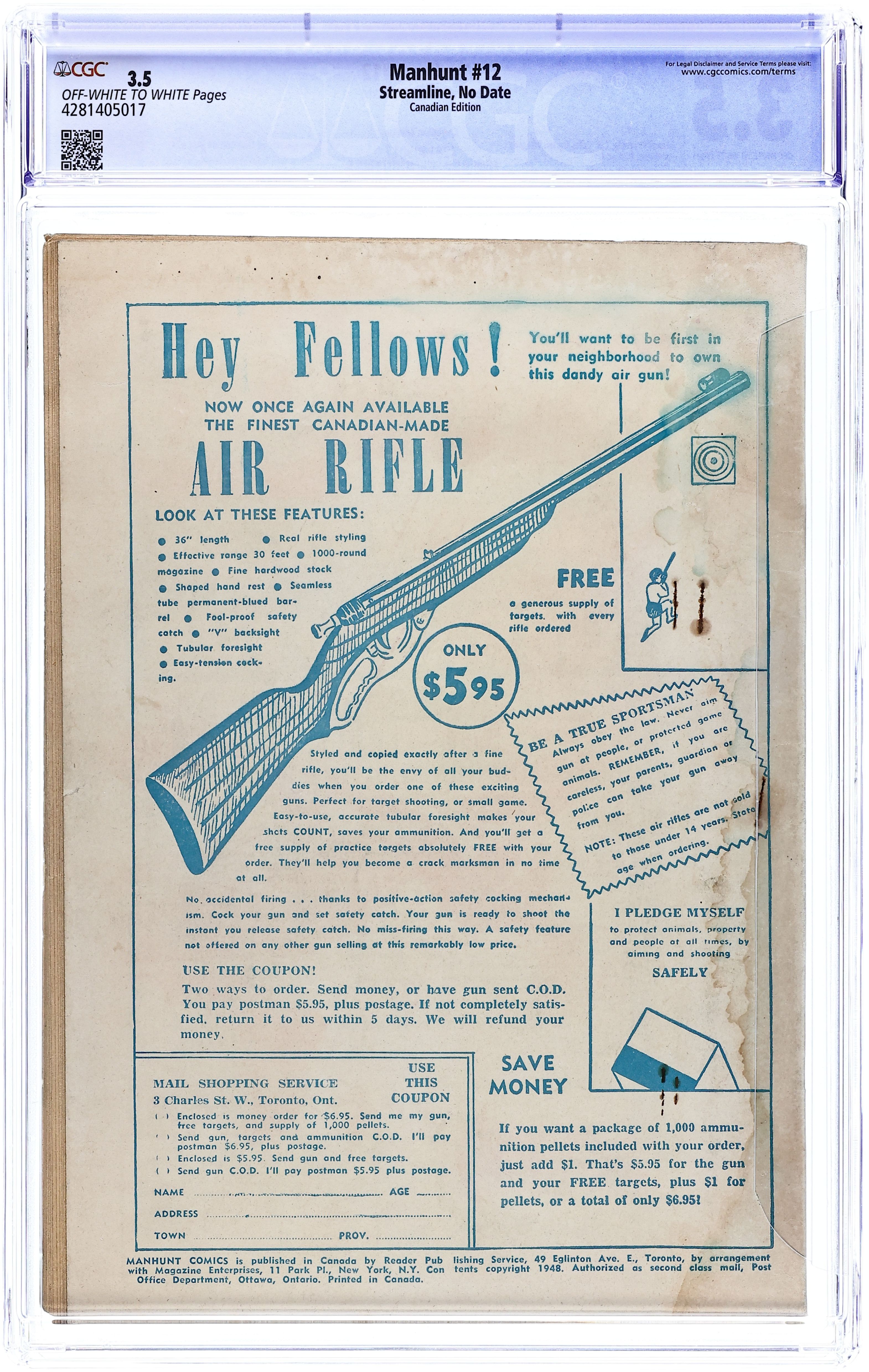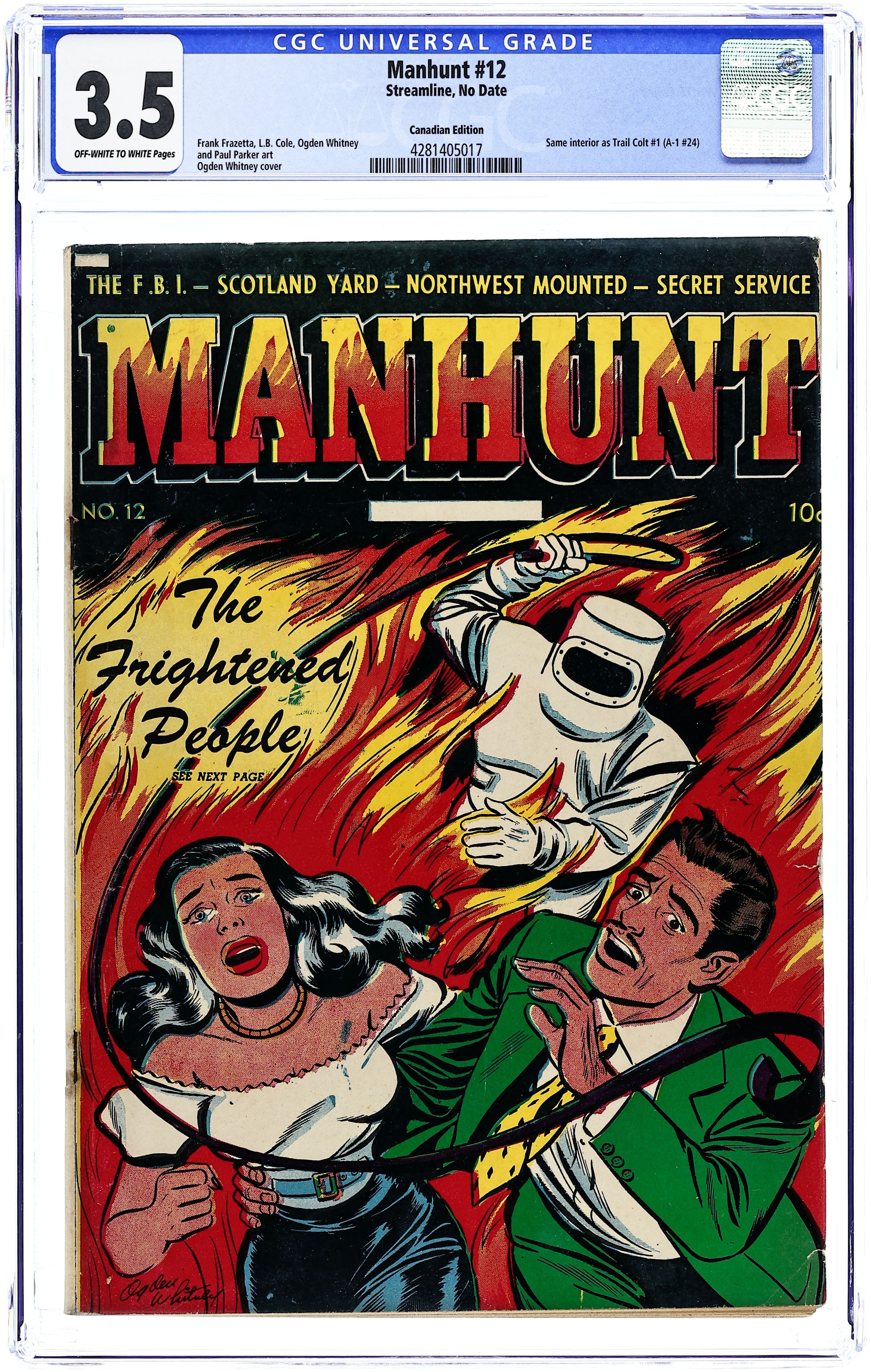 Canadian reprint series. Cover by Ogden Whitney. Art by Frank Frazetta, L.B. Cole, Ogden Whitney, and Paul Parker. Features reprints from the U.S. Series "Manhunt! (1947 Magazine Enterprises)". Cover may have been the originally intended cover for Issue 12 of the U.S. Series but was repurposed for this Canadian reprint issue. Contains same interior as Trail Colt (1949) #1. Stories include: The Rodeo Robbers! - Art by Frank Frazetta ; Undercover Girl - Art by Ogden Whitney; Red Fox - Art by L.B. Cole; Kirk of Scotland Yard - Art by Paul Parker; Fallon of the F.B.I - Art by Ogden Whitney;. Cover price $0.10.
