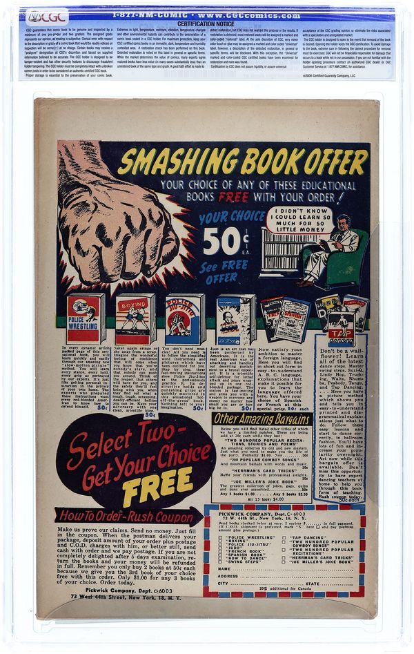 Cover art by Alex Schomburg. Dolls of Death starring Human Torch, art by Jimmy Thompson. Fountains of Flame starring Sub-Mariner, pencils by Allen Simon. Triple Mysteries starring Miss America, script by Otto Binder, art by Charles Nicholas. Cowboy text story. The Mystery of the Million Dollar Loot starring Patriot, pencils by Al Gabriele, inks by Vince Alascia. The Epicure of Crime starring Angle, art by Mort Lawrence. 52 pages. Cover price $0.10.