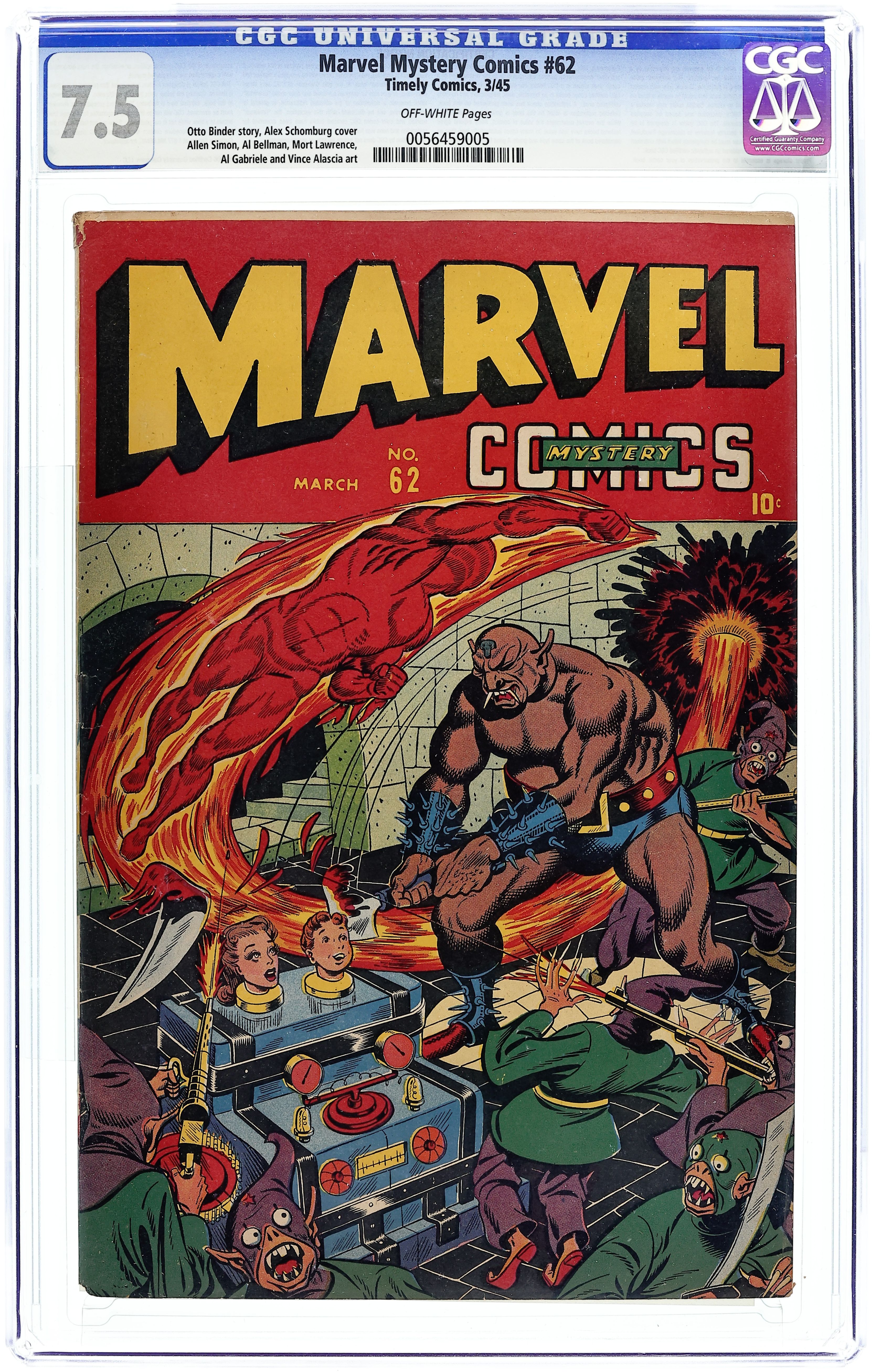 Cover art by Alex Schomburg. The Human Torch untitled story, script and art by Harry Sahle. Metal Monsters starring Sub-Mariner, art by Carl Pfeufer. Jimmy Jupiter untitled story, script and art by Ed Robbins. Bait for Suckers text story. Untitled Patriot story, pencils by Syd Shores. Master of Madness starring Vision, pencils by Syd Shores. Dr. Watson's Call To Fame starring Terry Vance, art by Bob Oksner. The Curse of Baron Trembieu starring Angel, art by Gustav Schrotter. 68 pages. Cover price $0.10.