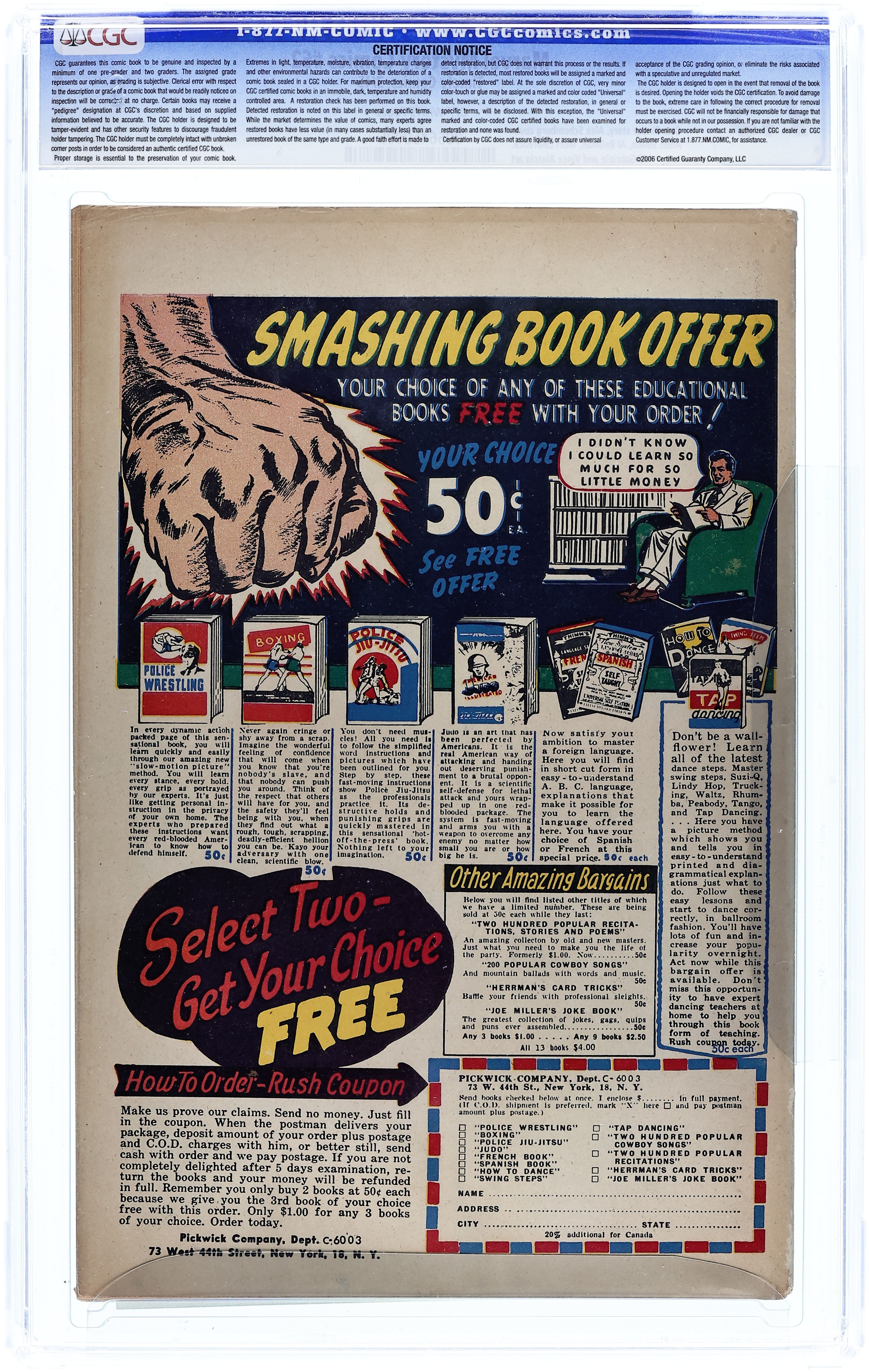Cover art by Syd Shores. Crime Marches On starring The Human Torch, art by Harry Sahle. A Whale of a Whopping Story starring Sub-Mariner, art by Carl Pfeufer. The Case of the Terrible-Tempered Tycoon starring Terry Vance, art by Bob Oksner. Smoked Out text story by Justin Dewey Triem. Robot's Revenge starring Vision, pencils by Shores. Jimmy Jupiter untitled story, script and art by Ed Robbins. Shadows over India starring Patriot, art by Al Fagaly. Death Comes Humming starring Angel, art by Gustav Schrotter. 68 pages. Cover price $0.10.