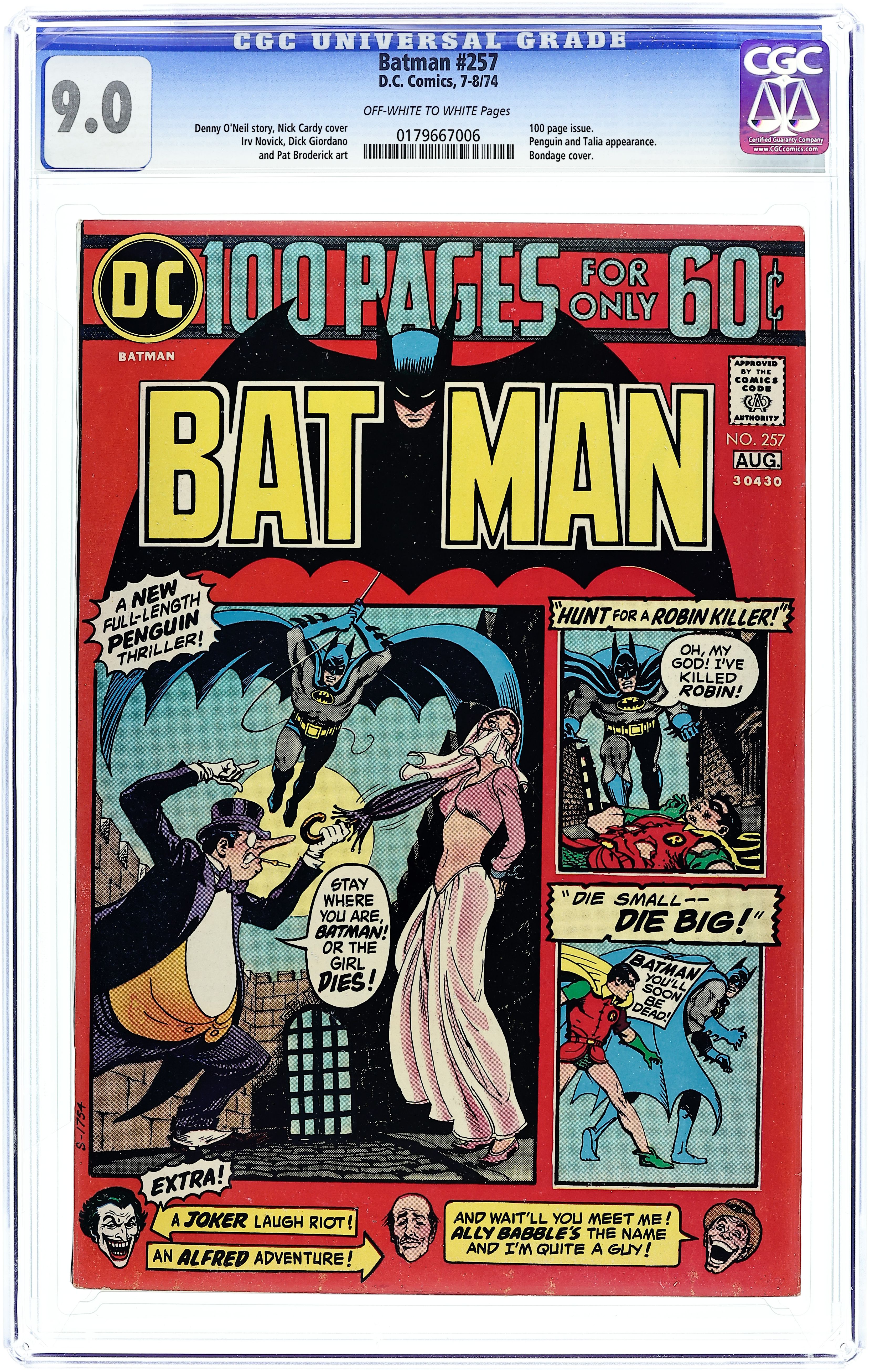 100-page giant. Cover by Nick Cardy. "Hail Emperor Penguin!", script by Denny O'Neil, pencils by Irv Novick, inks by Dick Giordano; When a young King is kidnapped by the Penguin, it takes the efforts of Batman, Robin and Talia to free him from the madman's clutches. The Penguin's Unique Umbrellas! panels from previous comics. "Hunt for a Robin-Killer!", script by Gardner F. Fox, art by Gil Kane; After finding the Boy Wonder nearly dead from a brutal beating, a vengeful Batman hits the streets to find the man responsible. One-page Casey the Cop story by Henry Boltinoff. "Ally Babble and the Fourteen Peeves!", script by Bill Finger, art by Dick Sprang; Ally Babble accepts the offer of $5000 from a rich man to eliminate 14 peeves he has against others, but is soon charged with ripping off the man who paid him. "Conversational Clue!", script by Mort Weisinger, art by Jerry Robinson; When Alfred accidently hears some unsettling conversation in a local library, he follows the clue up...which nearly costs him his life! "Die Small--Die Big!", script by Robert Kanigher, pencils by Bob Brown, inks by Joe Giella; The appearance of a man dressed as the Batman at a party at Wayne Mansion and carrying a death threat for the Caped Crusader spurs Batman to attack the problem alone without the aid of Robin. "Rackety-Rax Racket!", script by Don Cameron, art by Dick Sprang (as Bob Kane); A series of crazy college initiations are actually a blind for daring thefts masterminded by the Joker! 100 Pages, Full Color. Cover price $0.60.