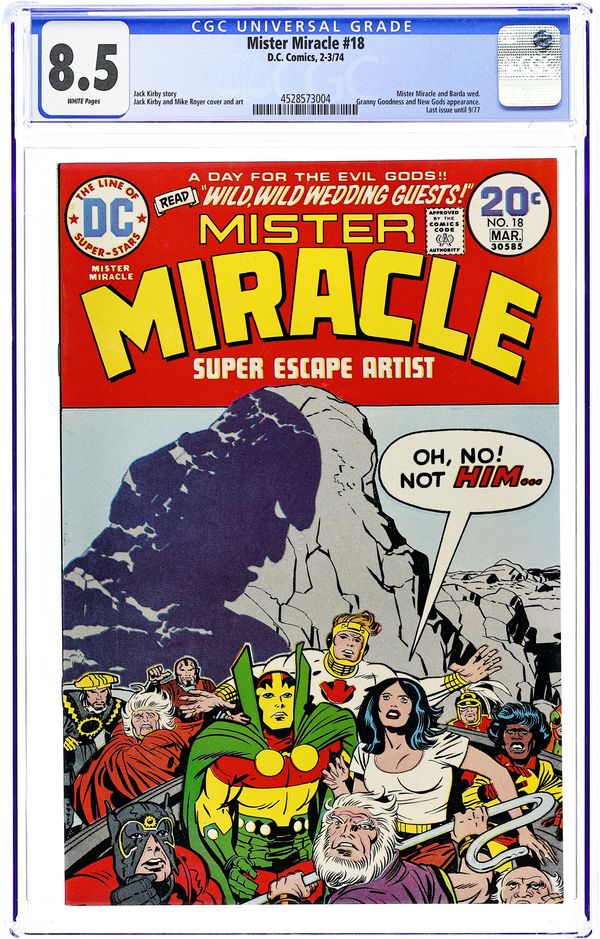 "Wild, Wild Wedding Guests." Scott "Mister Miracle" Free weds Big Barda and escapes a number of traps. Includes appearances by Darkseid, the Highfather, and other denizens of Apokolips. This is Kirby's last issue of the series, and it's a doozy. Script, pencils, and cover by Jack Kirby. Inks by Mike Royer. Cover price $0.20.