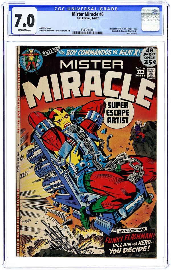 "Wait for Godot." Mister Miracle faces Funky Flashman and Houseroy, who appear to be modeled after Marvel's Stan Lee and Roy Thomas respectively, while Big Barda goes up against the Female Furies (making their first appearance). Script, pencils, and cover by Jack Kirby. Inks by Mike Royer. Cover price $0.25.