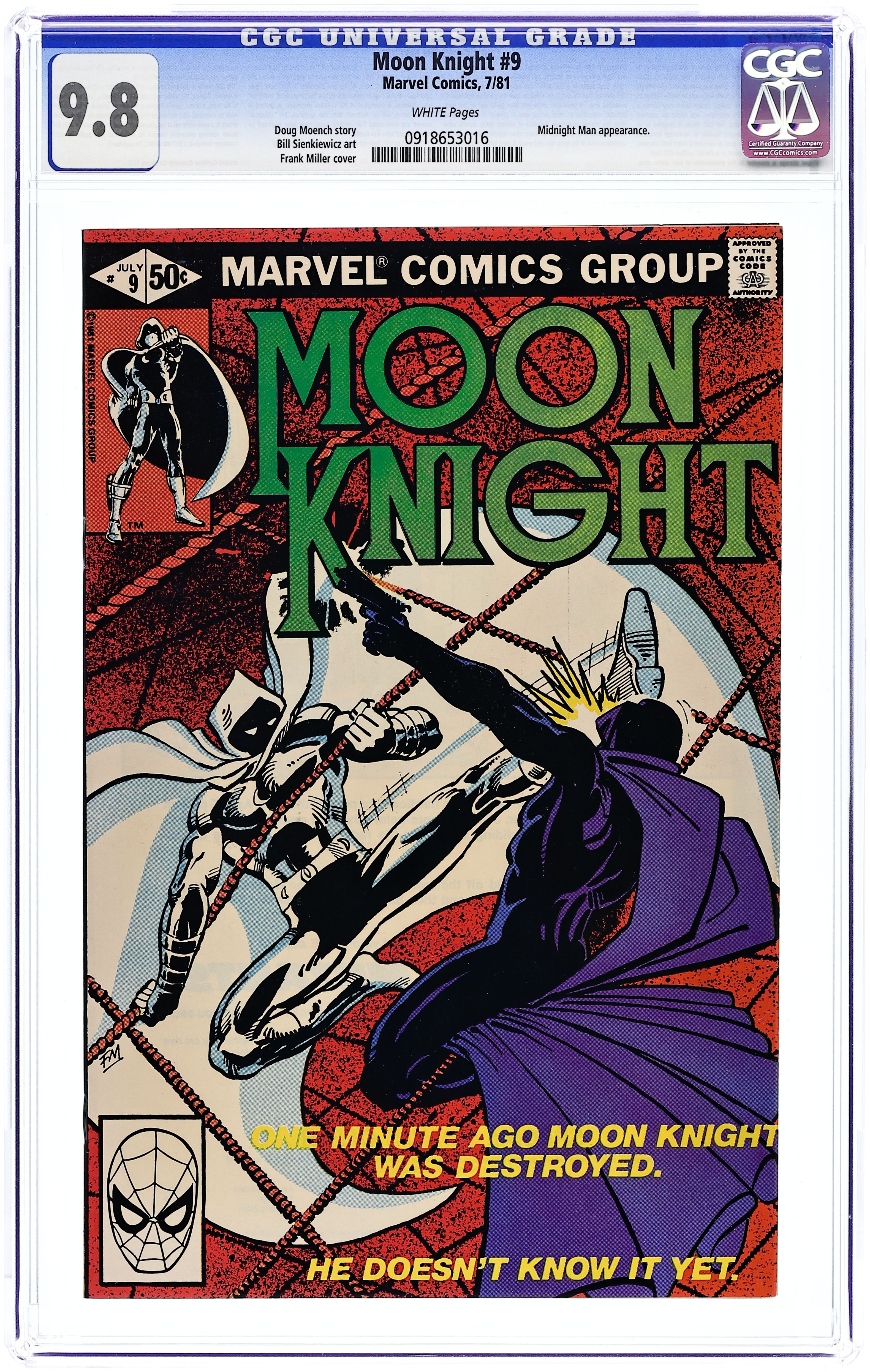 Direct Edition. "Midnight Means Murder!" Written by Doug Moench. Art by Bill Sienkiewicz. Moon Knight confronts killer whose unorthodox methods may prove to be the masked avenger's undoing. 32 pages, FC. Cover price $0.50.