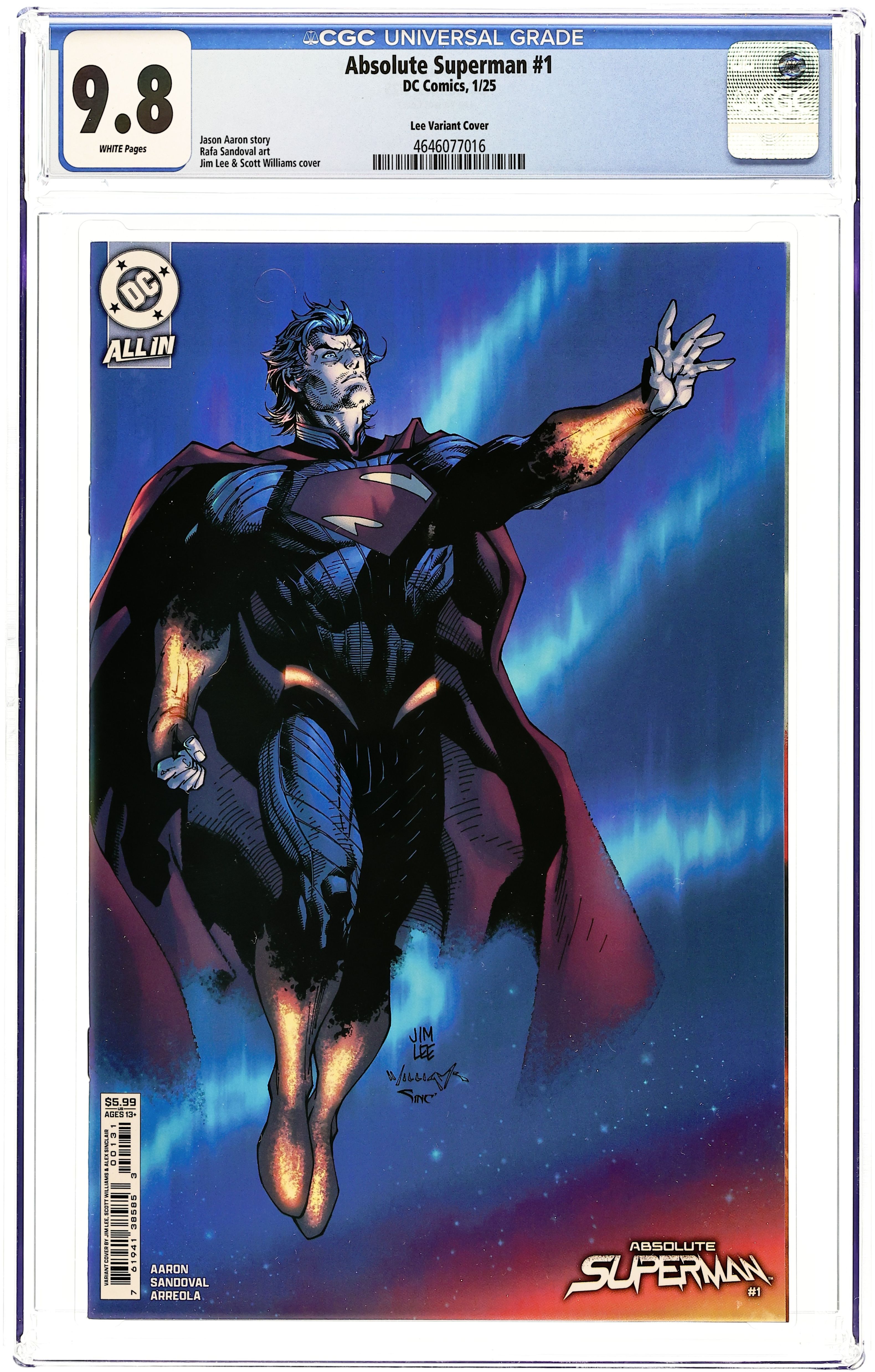 Written by Jason Aaron. Art by Rafa Sandoval. Cover by Jim Lee. SUPERSTARS JASON AARON AND RAFA SANDOVAL UNLEASH A SHOCKING NEW TAKE ON THE LAST SON OF KRYPTON! Without the fortress...without the family...without a home...what's left is the Absolute Man of Steel! 48 pages, full color. Rated T+ Cover price $4.99.