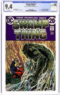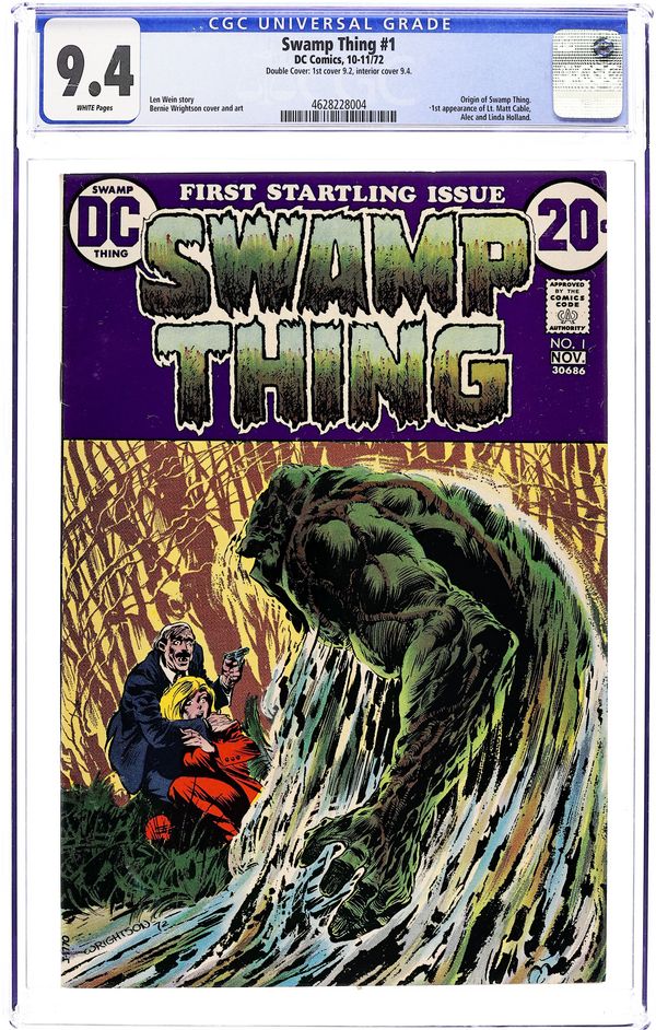 Starts Apr 4 "Dark Genesis." While working on a restorative formula (that can make forests out of deserts) in the Louisiana swamps, scientist Alec Holland is killed by a bomb set off by Mr. E., who wants the formula. Shortly thereafter, a humanoid plant being rises from the swamp, created from the body of Holland, the chemicals in the formula, and the strange forces in the swamp. 1st appearance of Alec and Linda Holland. 1st appearance of Matt Cable. (Swamp Thing himself first appeared in House of Secrets 92). Script by Len Wein, art and cover by Berni Wrightson. Includes brief bios of Wein and Wrightson. Cover price $0.20.