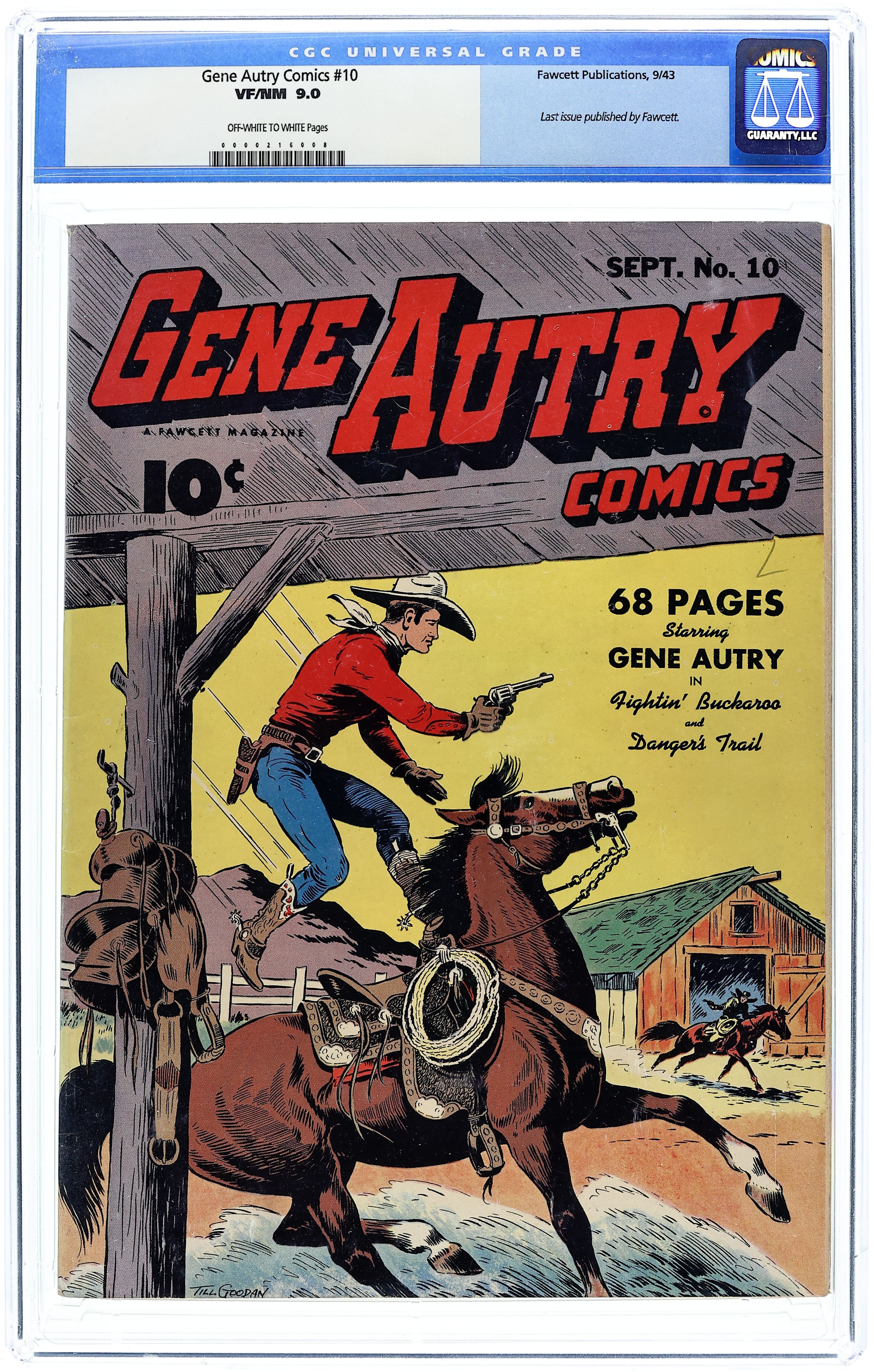 Cover by Till Goodan. Stories and art by Till Goodan and others. Western comics starring beloved singing cowboy Gene Autry. In a double-length story, before Gene can figure out who would attack a cargo coach, the owlhoots are shooting at Gene. Gene's fellow cowhand on a cattle drive sees evil omens, but although Gene doubts him, it turns out the unassuming Rosa really IS in league with rustlers. Gold Flash tries to protect Bart from the charge of an enraged steer. The Fightin' Buckaroo; Fool's Gold; Danger's Trail; Famous Bucking Horses: Conclusion, Duckin' Dolly; Gold Flash. 64 pages, Full Color. Cover price $0.10.