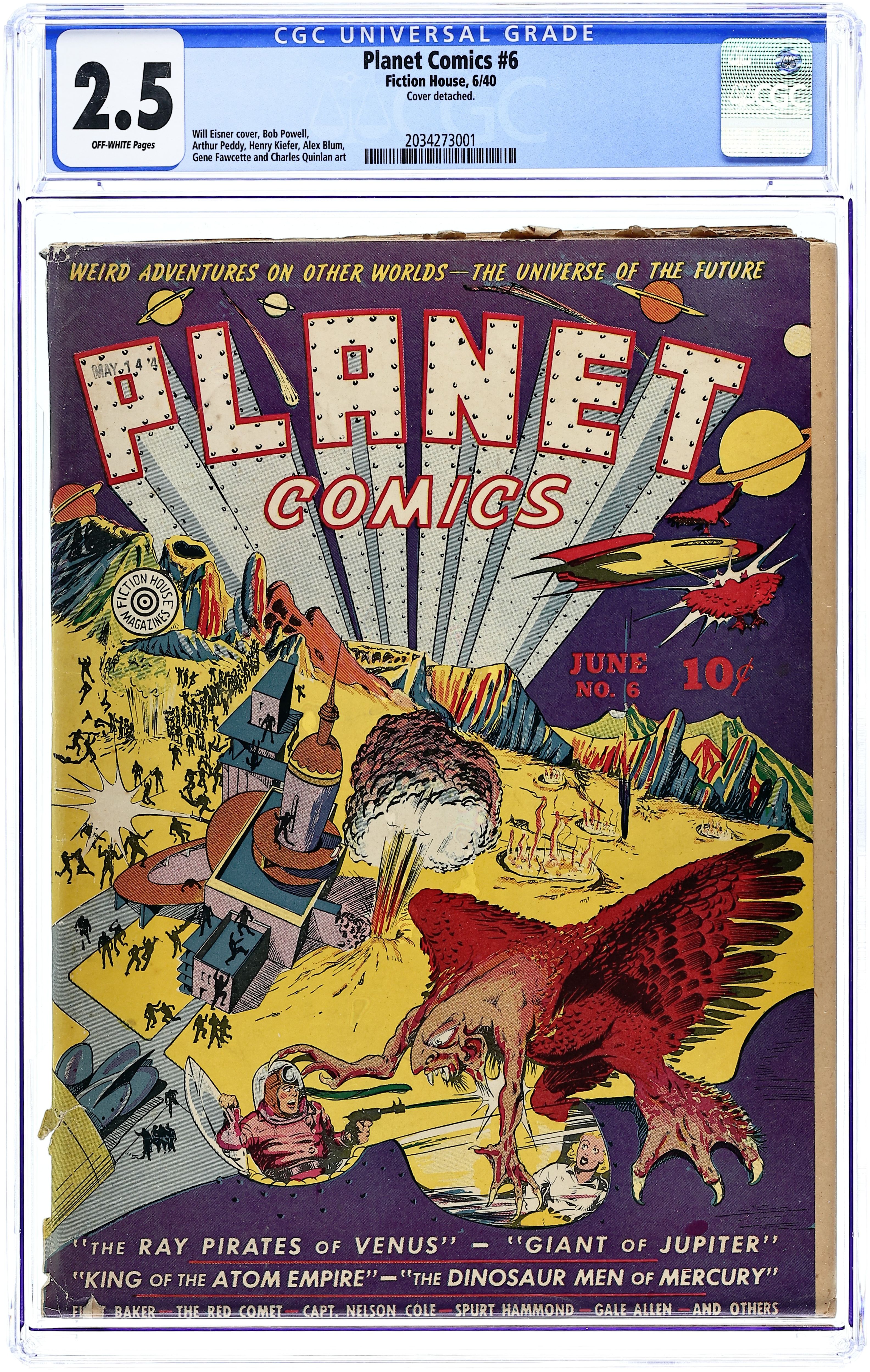 Cover by Will Eisner. Edited by Malcolm Reiss, Jerry Iger and Will Eisner. Stories and art by Alex Blum, Bob Powell, Arthur Peddy, Gene Fawcette, Henry C. Kiefer, and Charles M. Quinlan. The first true science fiction comic, Planet Comics featured classic space opera with square-jawed heroes, rockets, rayguns and bug-eyed aliens of every stripe. Don Granval battles monsters on a micro-world; The debut of Crash Barker, who travels the spaceways on his Zoom Sled; Gale Allen and her all-female interstellar fighting force battle pirate prince Blaga Daru. Giant of Jupiter; Gale Allen of the Girl Patrol; The Dinosaur Men of Mercury; Auro Lord of Jupiter; The Destruction of the Atomic Universe; Planet Payson; The Star Pirates; Buzz Crandall of the Space Patrol; The Ray Pirates of Venus; Fero Interplanetary Detective; Crash Barker and the Zoom Sled; Captain Nelson Cole of the Solar Air Force. 64 pages, Full Color. Cover price $0.10.