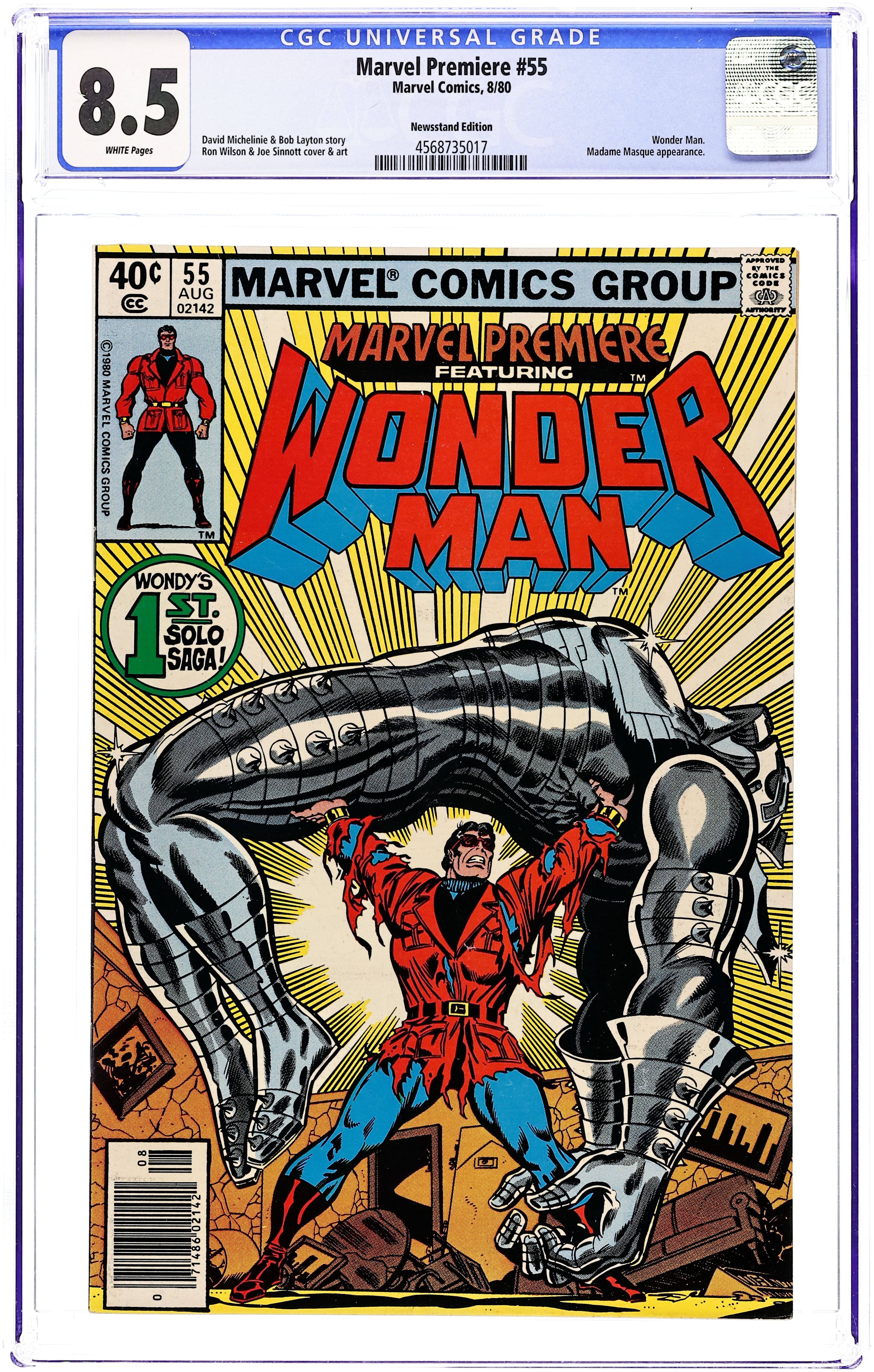 Direct Edition. Last 40-cent cover price. Wonder Man's first solo story, "A Force of Two!" Script by David Michalinie (co-plot by Bob Layton), pencils by Ron Wilson, inks by Joe Sinnott. Cover price $0.40.