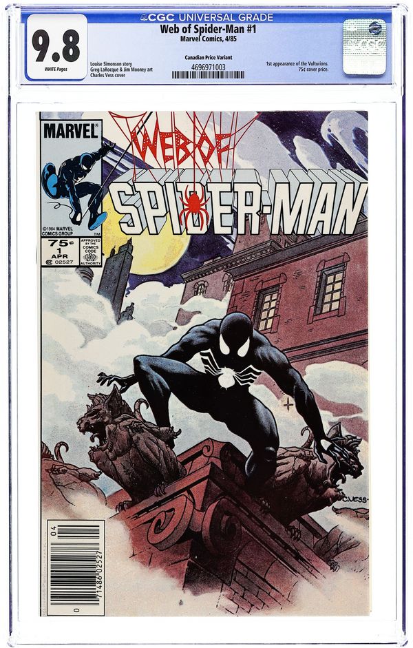 Canadian edition with $.75 cover price. "Til Death Do Us Part!" Story by Louise Simonson. Art by Greg LaRocque and Jim Mooney. Painted cover by Charles Vess. The alien symbiote (aka black costume) ambushes Peter Parker while he is getting dressed. Now Spider-Man must battle the black costume and the new Vulturions on his way to the Baxter Building! Meanwhile, Aunt May laments Peter's decision to drop out of graduate school. (Note: The Web of Spiderman series essentially replaced the Marvel Team-Up title as Marvel's third regular series featuring Spider-Man.) 36 pages. Colored. Newspaper Stock. Canadian Edition. Cover price $0.75.