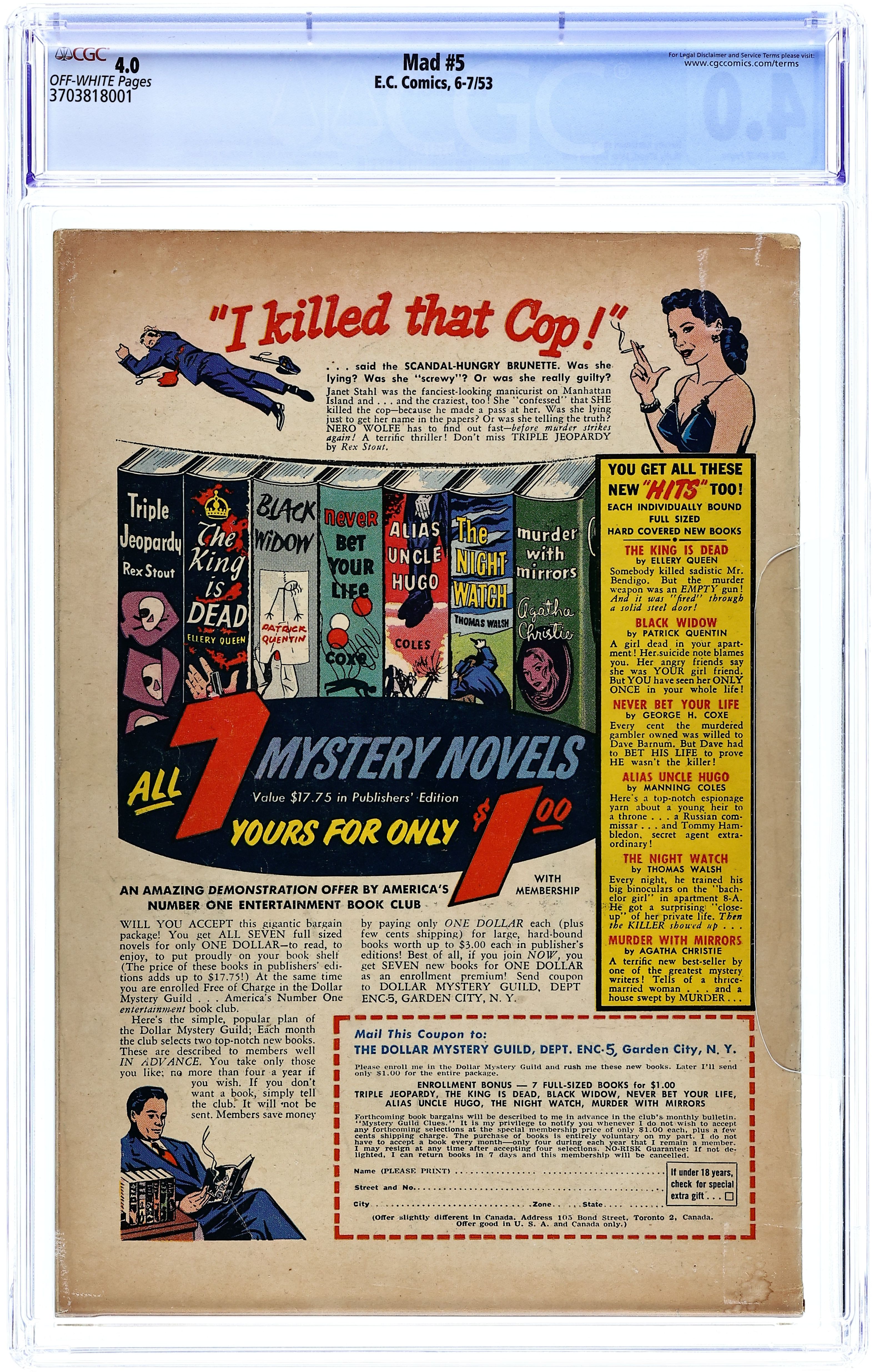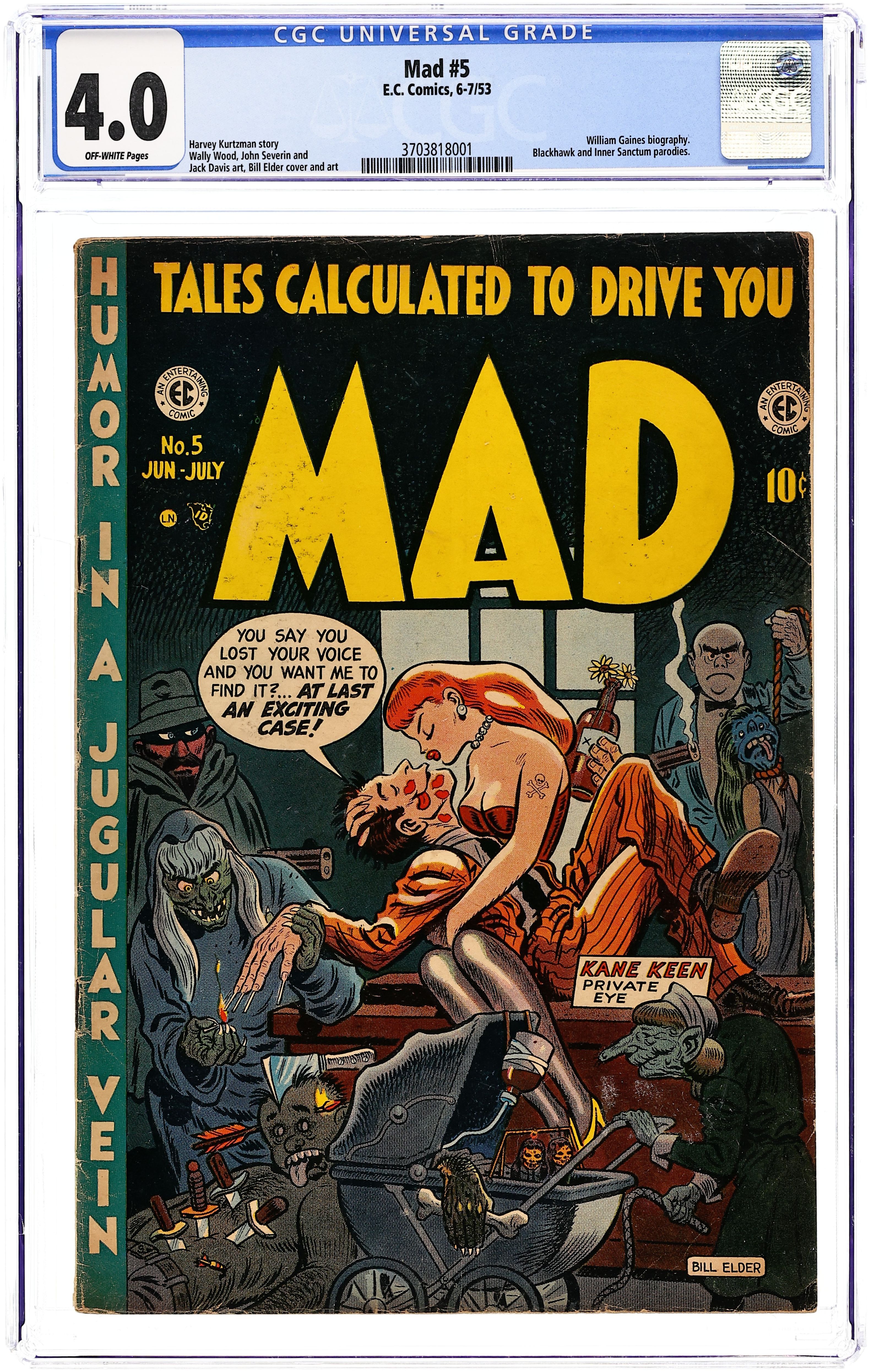 Low distribution. Cover by Bill Elder. The EC "Publisher of The Issue"; A fake biography of William M. Gaines. "Outer Sanctum!", art by Bill Elder; The Professor creates Heap and uses him to rob banks until Heap leaves to find a mate. "Black And Blue Hawks!", art by Wally Wood (as Woodhawk); The Black And Blue Hawks stage a mutiny; Blackhawks parody. E.C. comics ad. "Miltie of The Mounties!", art by John Severin; Miltie the Mountie doesn't get his man. "Kane Keen! Private Eye," art by Jack Davis; Kane finds the murderer: the butler did it. One-page William Gaines biography. 36 pgs., full color. $0.10. Cover price $0.10.