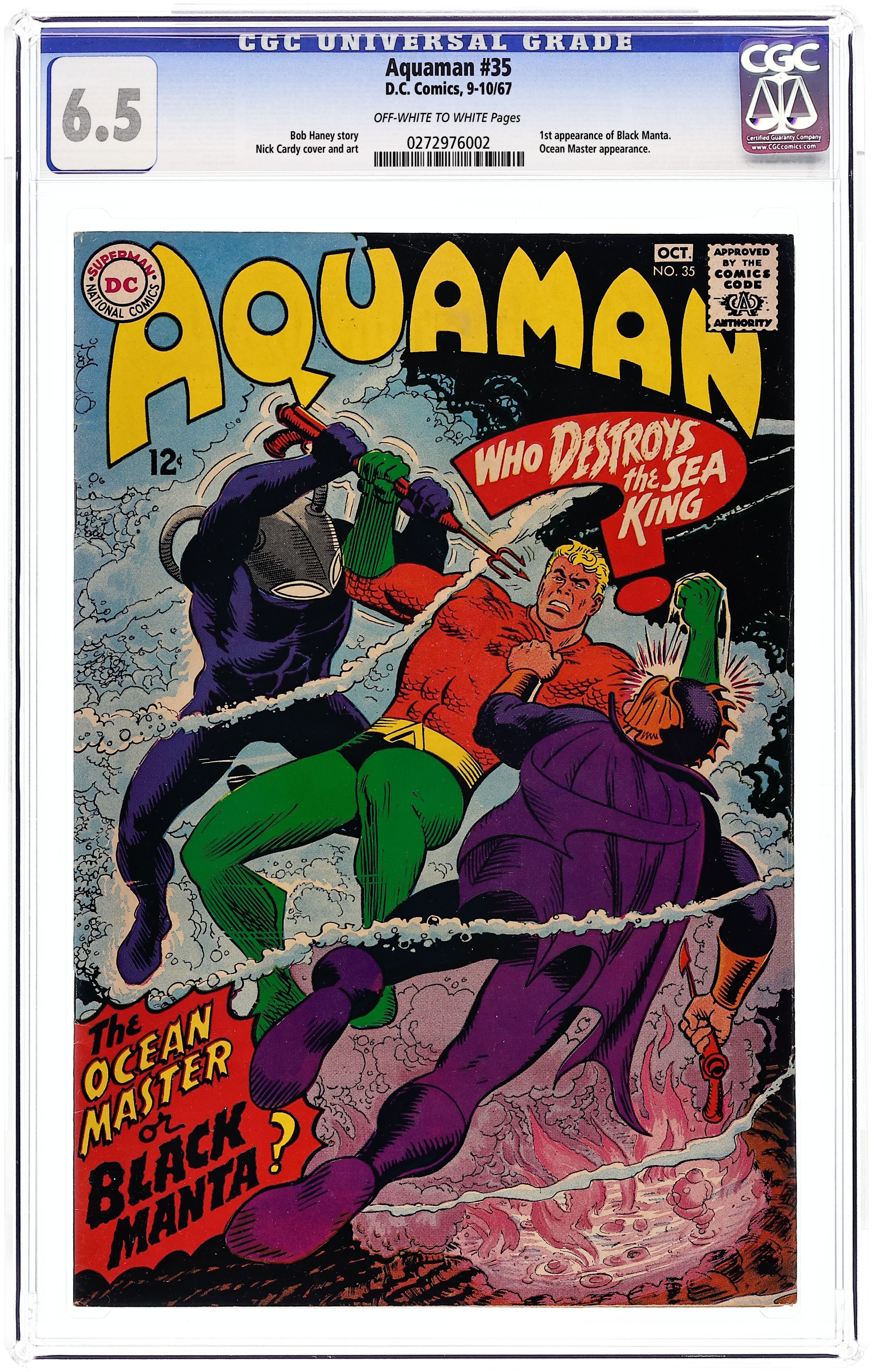 Cover art by Nick Cardy. The Haunted Sea, art by Nick Cardy; Aquaman and Aqualad accidentally free an evil sorcerer from the drop of water he and his henchmen were imprisoned in. Pioneers Under the Sea article. 36 pgs. $0.12. Cover price $0.12.