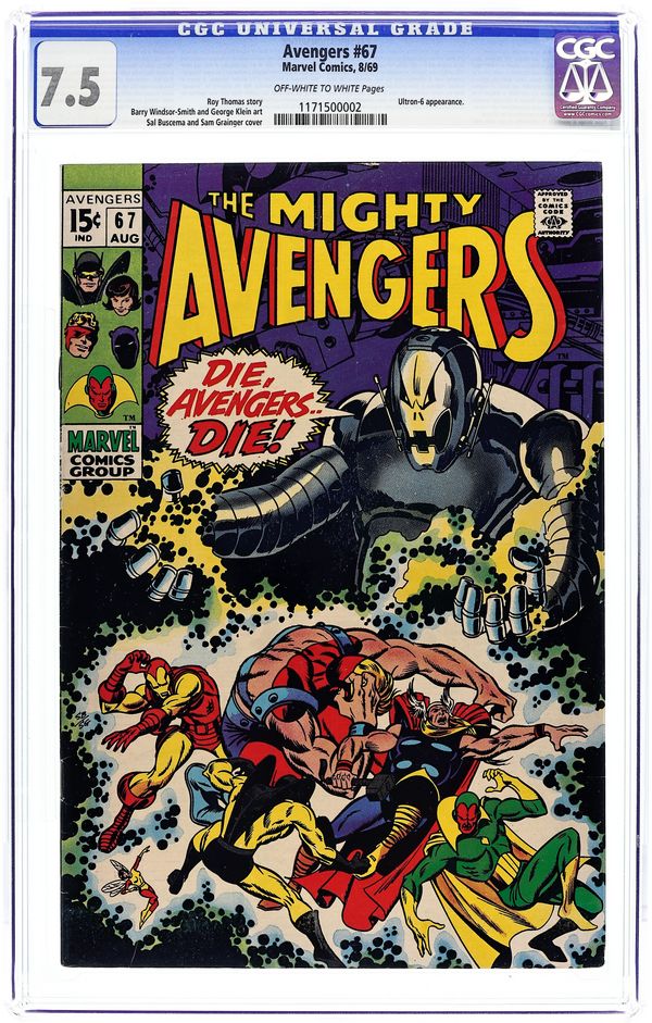 First 15 cent issue. "Betrayal!" Part 1 of 3. First appearance and use of adamantium. Script by Roy Thomas. Pencils by Barry Windsor-Smith. Inks by Syd Shores. Cover by John Buscema and Sam Grainger. Onboard the SHIELD Helicarrier, Earth's Mightiest Heroes test a new metal alloy called adamantium! The metal is so strong that even Thor's hammer cannot fracture it! Wow, what would happen if this awesome alloy fell into the wrong hands? Regrettably, the Avengers don't have to wait long for the answer as the Vision steals the adamantium and then ambushes his fellow avengers inside the mansion! What a shocking development! Could things get any worse? Perhaps only if the Vision's robotic creator were to suddenly appear! An excellent issue! Cameo appearance by Ultron-6. Avengers Lineup: Goliath, Iron Man, Thor, Vision, Wasp, and Yellowjacket. (Notes: Ultron previously appeared (as Ultron-5) in Avengers 57. This is the first of the five issues that Barry Windsor-Smith drew for the Avengers title (1st series): issues 66, 67, 98, 99, and 100. The letters page includes a letter from writer James Van Hise. This story was reprinted in Marvel Super Action 27.) 36 pages. Cover price $0.15.