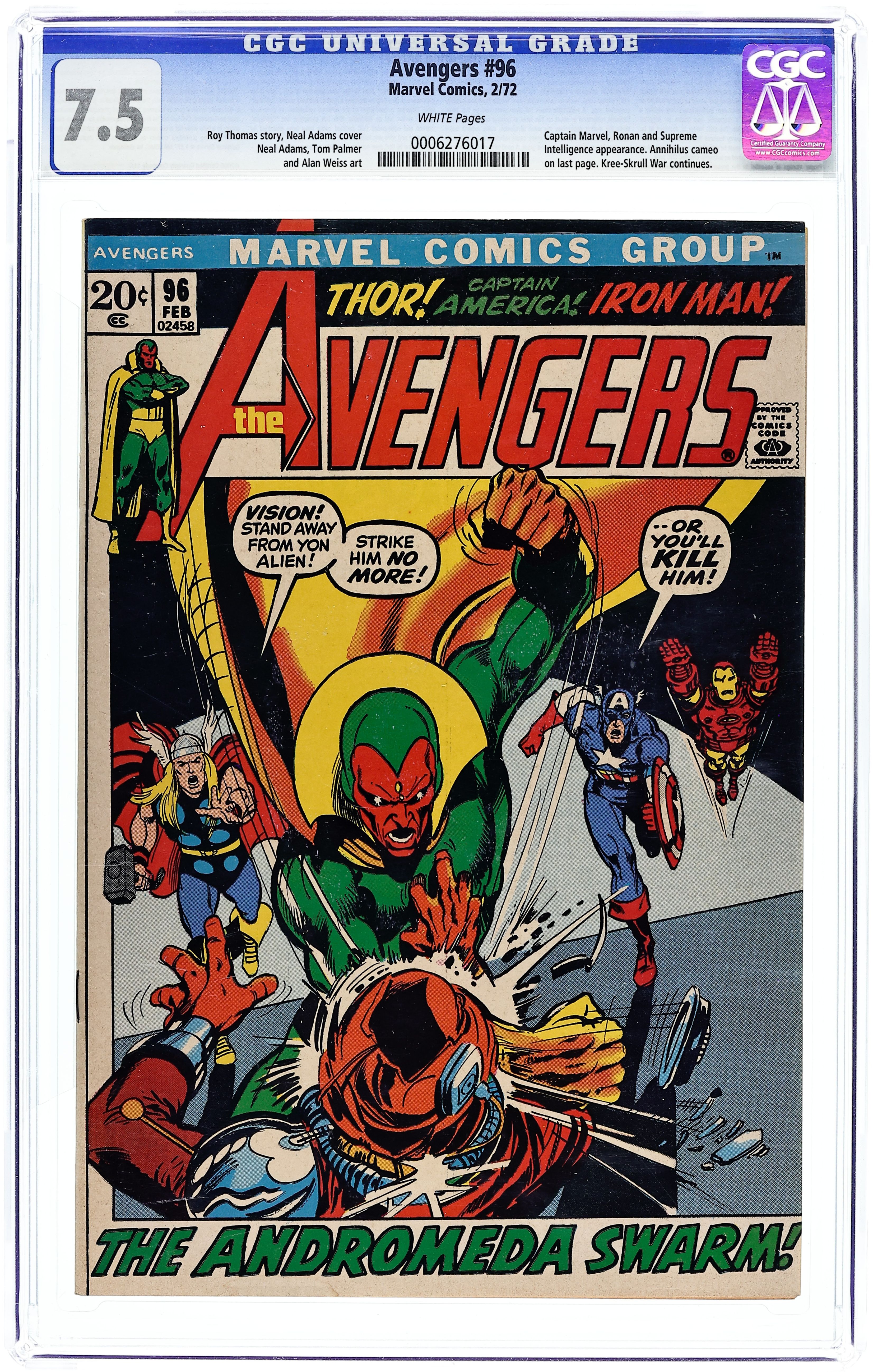 "The Andromeda Swarm!" Part 8 of 9. Guest-starring Captain Marvel. Script by Roy Thomas. Pencils by Neal Adams. Inks by Tom Palmer. Cover by Neal Adams and Tom Palmer. Finally, the Avengers blast off into outer space to take the fight to the Kree and the Skrulls! On the edge of the AndromedaGalaxy, Earth's Mightiest Heroes engage the awesome Skrull armada! Cap, Shell-Head, Thor, and the Vision attack the armada's flagship hoping to turn back the entire fleet! During the ferocious battle inside, the Avengershear about the Skrulls' secret plan to destroy the Earth! And as shown on the dynamic cover, an enraged Vision will do whatever it takes to uncover the devious plan (and rescue the Scarlet Witch)! Meanwhile on Hala, the Kree home planet; the power struggle between the Supreme Intelligence and Ronan the Accuser quietly rages behind the scenes...with Rick Jones caught in the middle! Cameo appearances by Nick Fury and Annihilus. Avengers Lineup: Captain America, Goliath, Iron Man, Quicksilver, Scarlet Witch, Thor, and the Vision. 36 pages. Cover price $0.20.
