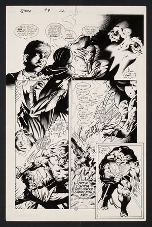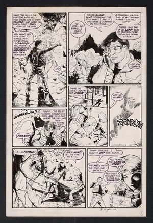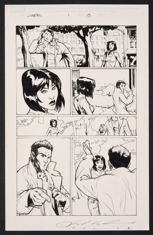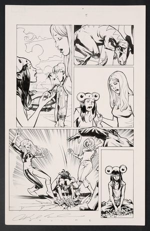 Original Art from Bloodstone #3 (2002) Page 13 Pencils by Michael Lopez, Inks by Scott Hanna from Bloodstone (2001 Marvel) 3 2002 Marvel As Elsa Bloodstone wraps up her first big monster-hunting outing, we're taken to Zaire where a crew of armored troops prepare to do a little testing on a village overrun by vampires. Some great storytelling on this page, especially in that striking first panel! Signed by Hanna on the reverse. Pencil and ink on Marvel Comics art board. 11 1/4" x 17 1/4". |