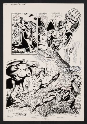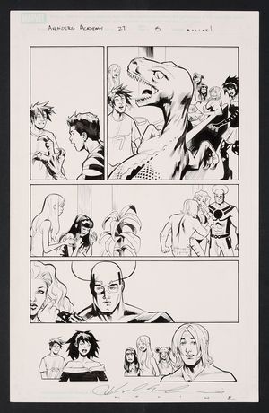 Original Art from Avengers Academy #27 (2012) Page 15 Pencils by Karl Moline, Inks by Jim Fern from Avengers Academy (2010) 27 2012 Marvel Reptil shows off his shapeshifting abilities to the Runaways as the two teams of young heroes await Hank Pym's word that they're ready to rescue Old Lace. Signed by Moline in lower margin. Pencil and ink on Marvel Comics art board. 11" x 17 1/4". |