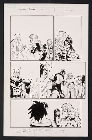 Original Art from Avengers Academy #28 (2012) Page 15 Pencils by Karl Moline, Inks by Jim Fern from Avengers Academy (2010) 28 2012 Marvel Having achieved empathy and understand thanks to a spell from Nico, the Runaways and the Avengers Academy make up after fighting one and a half super-powered battles over the Runaways' vagabond lifestyle in the wake of the Superhuman Registration Act. Signed by Moline in lower margin. Pencil and ink on Marvel Comics art board. 11" x 17 1/4". |