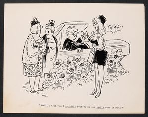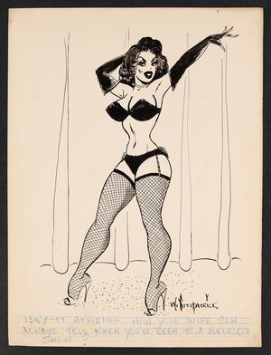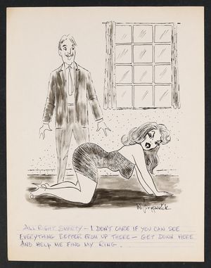 Original Art Lost Ring Pinup Gag Strip by Walter Fitzpatrick 1950s While the place of publication for this piece is unknown, Fitzpatrick was a prolific cartoonist contributing mainly to various Humorama publications like Jest and Gaze in the 50's and early 60's. Signed by the artist. Pencil and ink on paper. 8 1/2" x 11". |