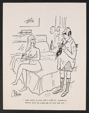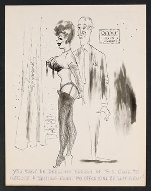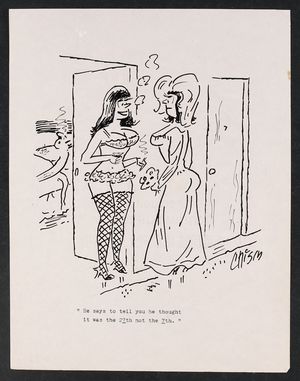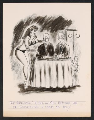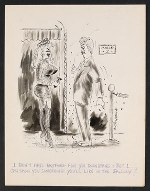 Original Art Helpful Usher Pinup Gag Strip by Walter Fitzpatrick 1950s While the place of publication for this piece is unknown, Fitzpatrick was a prolific cartoonist contributing mainly to various Humorama publications like Jest and Gaze in the 50's and early 60's. Signed by the artist. Pencil and ink on paper. 8 1/2" x 11". |