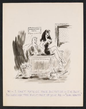 Original Art Girl Wanted Pinup Gag Strip by Walter Fitzpatrick 1950s While the place of publication for this piece is unknown, Fitzpatrick was a prolific cartoonist contributing mainly to various Humorama publications like Jest and Gaze in the 50's and early 60's. Signed by the artist. Pencil and ink on paper. 8 1/2" x 11". |