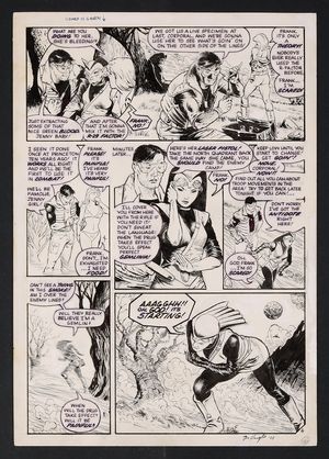 Original Art from Bloodstone #3 (2002) Page 16 Pencils by Michael Lopez, Inks by Scott Hanna from Bloodstone (2001 Marvel) 3 2002 Marvel A great reveal for this interlude teasing the danger Elsa Bloodstone will soon face! After raining down holy water on a vampire-infested village, the masked operators return to their helicopter for evac- where it's revealed that they themselves are vampires! Signed by Hanna on the reverse. Pencil and ink on Marvel Comics art board. 11 1/4" x 17 1/4". |