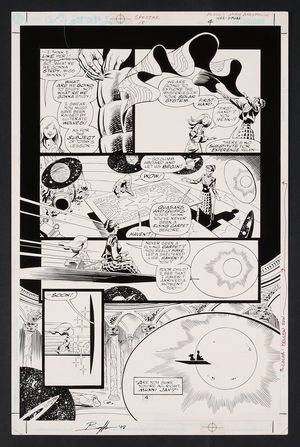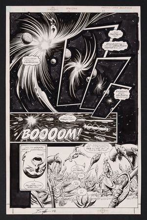 Original Art from Booster Gold #47 (2011) Page 19 Pencils by Dan Jurgens, Inks by Norm Rapmund 2011 DC This page finds booster appearing in the Vanishing Point, a place outside the waves of time. He doesn't know why or how he got there- in fact, the only thing he does know is that he needs a new suit. Pencil and ink on DC Comics art board. 11" X 17". |