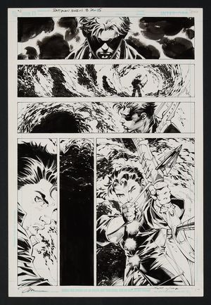 Original Art from All Star Batman and Robin the Boy Wonder #8 (2008) Page 15 Pencils by Jim Lee, Inks by Scott Williams from All Star Batman and Robin the Boy Wonder (2005) 8A 2008 DC "I need some tights. And a mask." says a young Dick Grayson to the "British accent" speaking to him from the darkness of the cave in this fantastic page from one of the biggest books of the 00's! Frank Miller's prequel to his legendary Dark Knight Returns is, to put it lightly, absolutely bonkers (complimentary). A much harder-edged take on the mythos, we see Batman rescue a young Dick Grayson and...lock him in the Batcave with no food and no clue what's going on. Of course the young acrobat rises to challenge and embraces his destiny with a little help from the Bat-armory, grabbing a bow and fashioning himself after Robin Hood. Signed by the artists in lower margin. Pencil and ink on DC Comics art board. 11 1/2" x 17". |