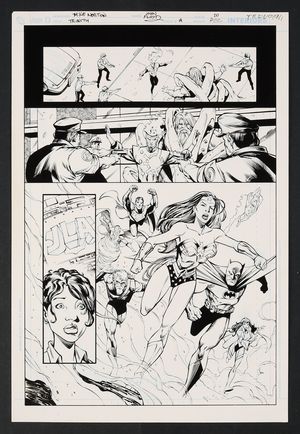 Original Art from Trinity #19 (2008) Page 20 Inks by John Floyd, Printed Pencils by Mike Norton 2008 DC Something isn't right in the world! After the Troika's victory, Superman, Batman, and Wonder Woman are erased from existence- though their legacies do endure in the subconscious of the world's citizens. Some great action on this page as Firestorm, unaffected by the change and trying to make sense of this new reality, stops to take down Mammoth triggering a memory of the original Justice League in a civilian- a fantastic half-splash of the JLA rushing into action! Ink over printed pencils on DC Comics art board. 11" X 17". |