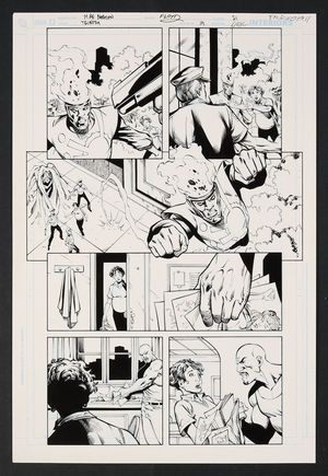 Original Art from Trinity #19 (2008) Page 21 Inks by John Floyd, Printed Pencils by Mike Norton 2008 DC In a world where Batman, Superman, and Wonder Woman never existed, those who remain struggle with both the new order of the world and with visions of what should be. As Firestorm finds his heroics not welcome here, a civilian named Desiree returns home to find her abusive husband unhappy with her drawings of the world before. Ink over printed pencils on DC Comics art board. 11" X 17". |