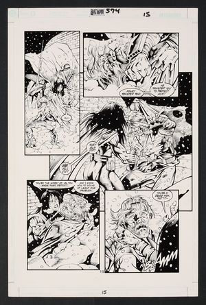 Original Art from Batman #574 (2000) Page 15 Pencils by Dale Eaglesham, Inks by John Floyd 2000 DC Huntress has a particularly rough time in No Man's Land- and things aren't getting any easier! In the second chapter of the story's final arc, Helena finds herself caught between William Pettit, leader of a militia made up of former GCPD, and the Joker. After shooting one of his own men for desertion, Huntress has had enough and begins beating him senseless in this brutal fight page- just as he's struck by a bullet from off page. Pencil and ink on DC Comics art board. 11 1/4" X 17". |