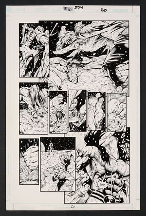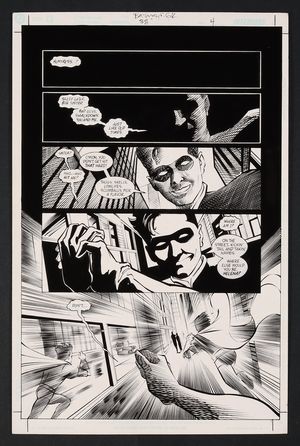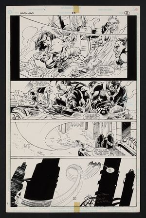 Original Art from Batman Gotham Knights #49 (2004) Page 18 Pencils by Charlie Adlard, Inks by John Floyd from Batman Gotham Knights (2000) 49 2004 DC The Bat family has closed in on Bane and his biological father King Snake as they attempt to loot a powerful weapon and in the heat of the fight, Bane makes choice- the man who once broke the Bat sacrifices himself to save the Bat! Pencil and ink on DC Comics art board. 11 1/4" x 17" |