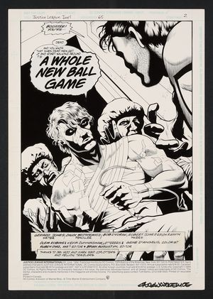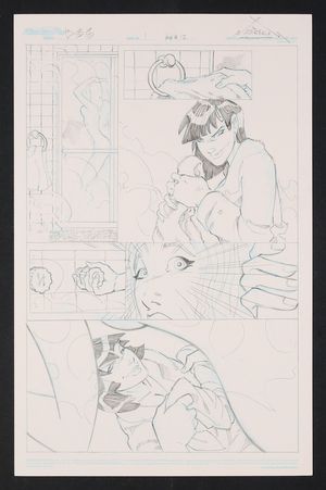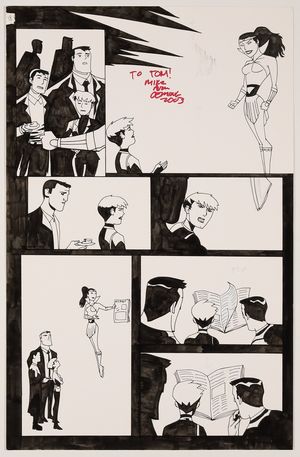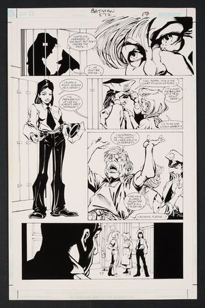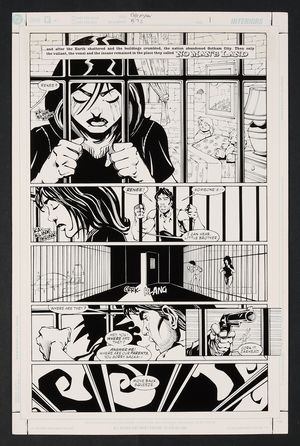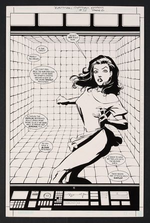 Original Art from Batman Gotham Knights #38 (2003) Page 6 Pencils by Roger Robinson, Inks by John Floyd 2003 DC A great mirror to the title page that immediately precedes this page that saw Huntress in the exact same pose clad in the Bronze Age Huntress costume, here we get the reveal that she's actually locked in a padded cell and being monitored by someone with an affinity for blondes. Pencil and ink on DC Comics art board. 11 1/4" X 17". |