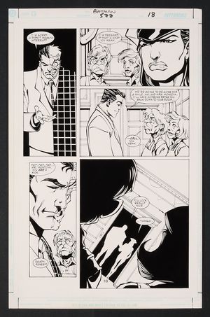 Original Art from Batman #572 (1999) Page 18 Pencils by Damion Scott, Inks by John Floyd 1999 DC A fantastically drawn panel of Two-Face opens this page as he interrupts Renee's reunion with her parents when he comes to begin...well we don't know what it is yet, but knowing Two-Face it's probably a really dramatic mock trial of some kind! Pencil and ink on DC Comics art board. 11 1/4" X 17". |