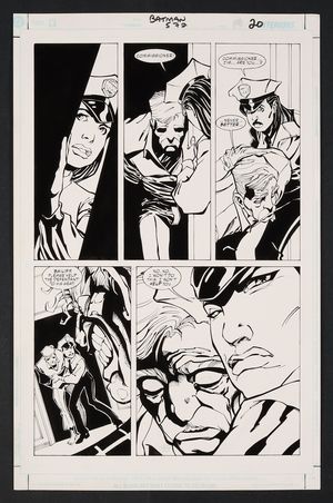 Original Art from Batman #572 (1999) Page 20 Pencils by Damion Scott, Inks by John Floyd 1999 DC The psychological thriller that is the Renee Montoya and Two-Face subplot of No Man's Land comes to a head here as the defendant for Two-Face's trial is revealed to be none other than Commissioner Jim Gordon! Pencil and ink on DC Comics art board. 11 1/4" X 17". |