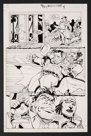 Original Art from Detective Comics #739 (1999) Page 5 Pencils by Damion Scott, Inks by John Floyd 1999 DC Harvey Bullock, master negotiator, puts his skills to the test in this dynamic page- unfortunately things don't go his way as he is promptly shot in the chest! Good thing he wore the Kevlar. Pencil and ink on DC Comics art board. 11 1/4" X 17". |